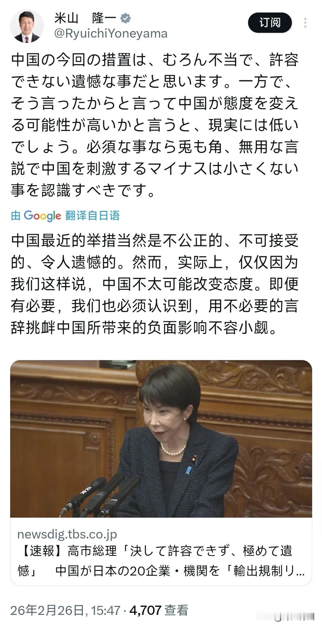 日本众议员、前新潟县知事米山隆一今天(2月26日)写道:“我认为中国此次的举措无疑是不当的,也是令人遗憾、无法接受的。但另一方面,即便如此表态,中国改变立场的可能性在现实中想必也很低。我们理应认识到,若是必要的表态倒也罢了,用不必要的言辞挑衅中国所带来的负面影响不容小觑。” 评几句: 日本众议员、前新潟县知事米山隆一的一番表态,在日本国内引发广泛讨论。他在表达自身看法的同时,也客观指出,从现实角度来看,中国在核心立场上并不会轻易改变。 更值得关注的是,米山隆一明确提醒:正常表态可以理解,但如果用过激言论制造矛盾,只会带来负面效果,得不偿失。在当前环境下,这样的观点显得十分理性。 中日两国一衣带水,经贸合作与民间交流十分密切,两国关系稳定,符合彼此的共同利益。中方在核心问题上的态度一向清晰明确,单方面的做法并不能改变现实。 米山隆一的理性声音,也给外界带来启示:国与国之间,唯有相互尊重、加强对话,才是长久之道。坚持理性沟通,才能真正维护好共同利益。