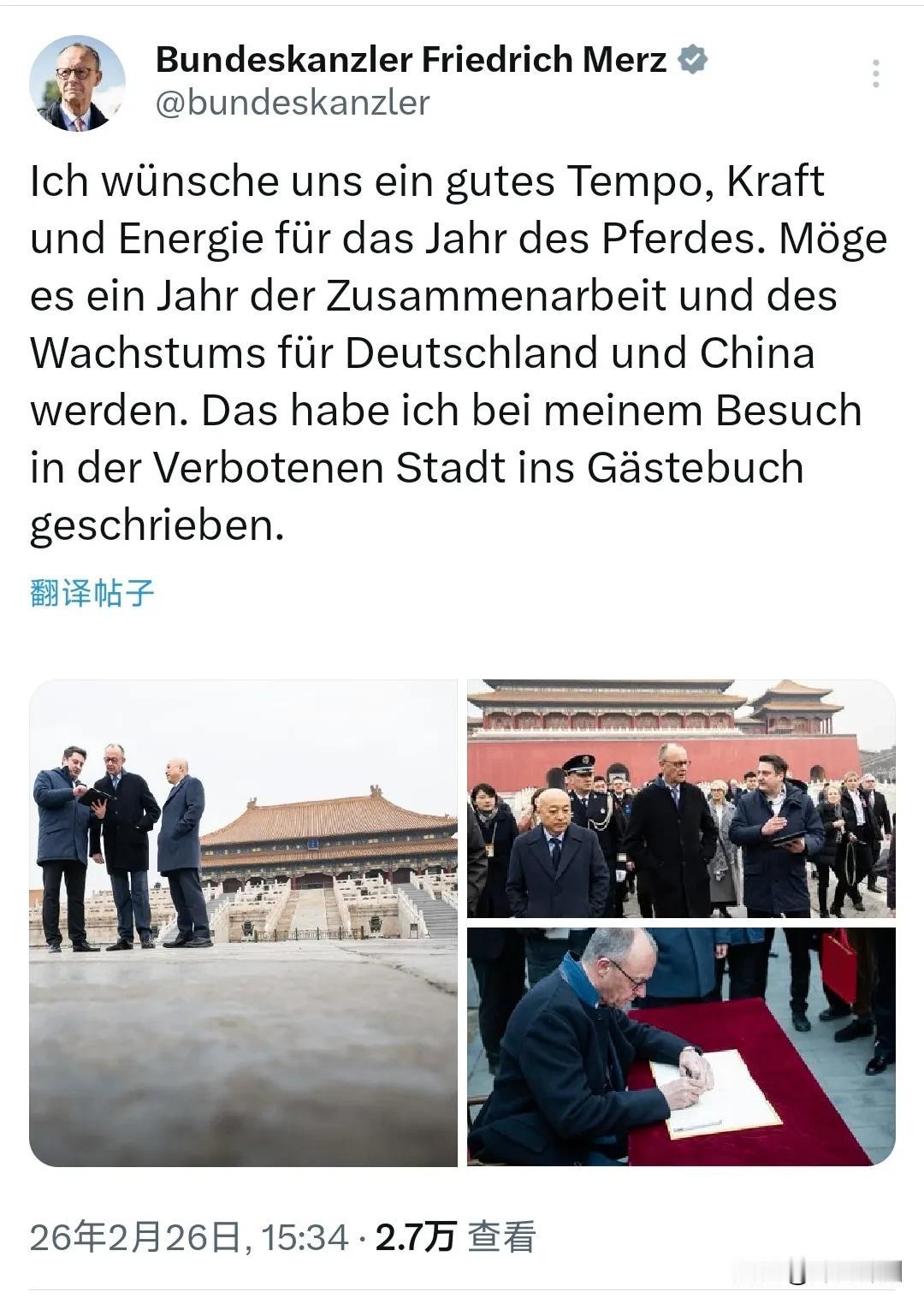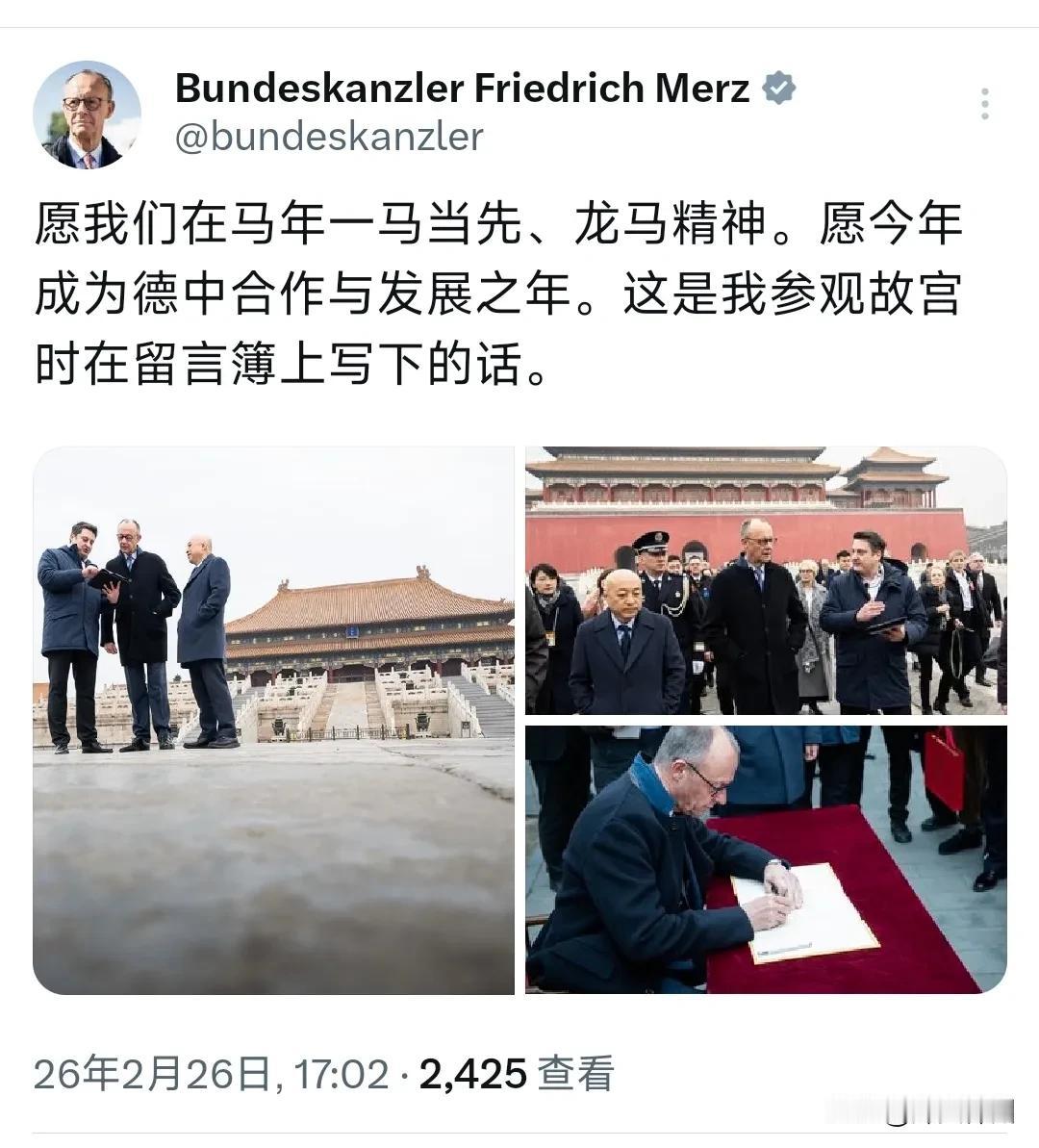 德国总理默茨今天(2月26日)写道:“愿我们在马年一马当先、龙马精神。愿今年成为德中合作与发展之年。这是我参观故宫时在留言簿上写下的话。” 评几句: 德国总理默茨访华期间,在故宫写下中文祝福,引发广泛关注。他特意用马年成语送上祝愿:愿德中一马当先、龙马精神,推动两国合作与发展。这番接地气的表态,尽显对中国文化的尊重与诚意。 作为马年访华的外国领导人,默茨走进故宫、亲笔寄语,细节之处尽显友好。中德作为全球重要经济体,在经贸、科技、人文等领域合作紧密,互利共赢才是人心所向、大势所趋。 复杂国际环境下,相互尊重、加强沟通,才是共赢之道。默茨的真诚寄语,既是美好祝福,更是务实选择。新的一年,中德携手共进、深化合作,必将为两国人民带来更多福祉,也为世界和平与发展注入强大动力。