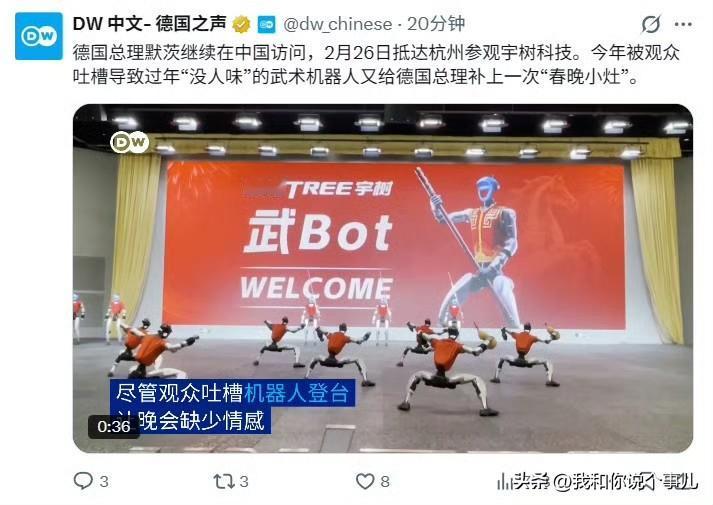 DW中文-德国之声:德国总理默茨继续在中国访问,2月26日抵达杭州参观宇树科技。今年被观众吐槽导致过年“没人味”的武术机器人又给德国总理补上一次“春晚小灶”。 现场德国记者评价:默茨体验到了中德角色互换的滋味,过去中国依赖德国技术(如奥迪发动机),如今德国车企反向购买中国电动平台授权,体现汽车行业从“追赶”到“被追赶”的转变。盾构机领域同样反转,早年中国高价进口德国设备并支付高额维护费,现在德国采购中国盾构机后,中方专家常驻德国提供技术支持。面对“中国冲击波”,德国商界出现“冰火两重天”的焦虑,部分欧洲地区(如巴伐利亚州)主动欢迎中国投资,主张“既然欧洲人买中国货,不如让中企本地生产”,反对保护主义孤立政策。 感觉德国总理参观最大作用是告诉外网,这玩意是真的,不是Ai,这下外网酸民总不好说AI 视频了吧?