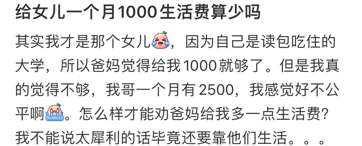 给女儿一个月1000生活费算少吗