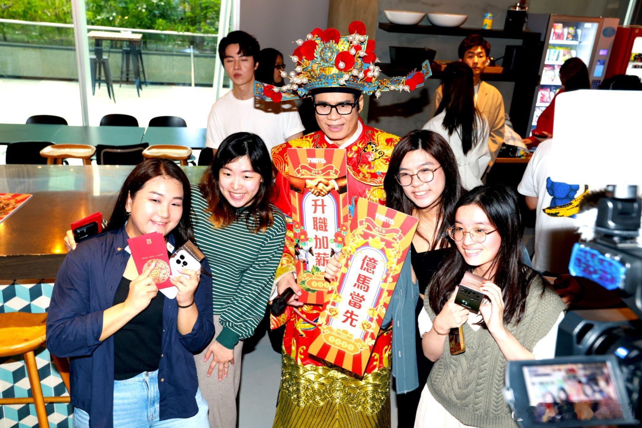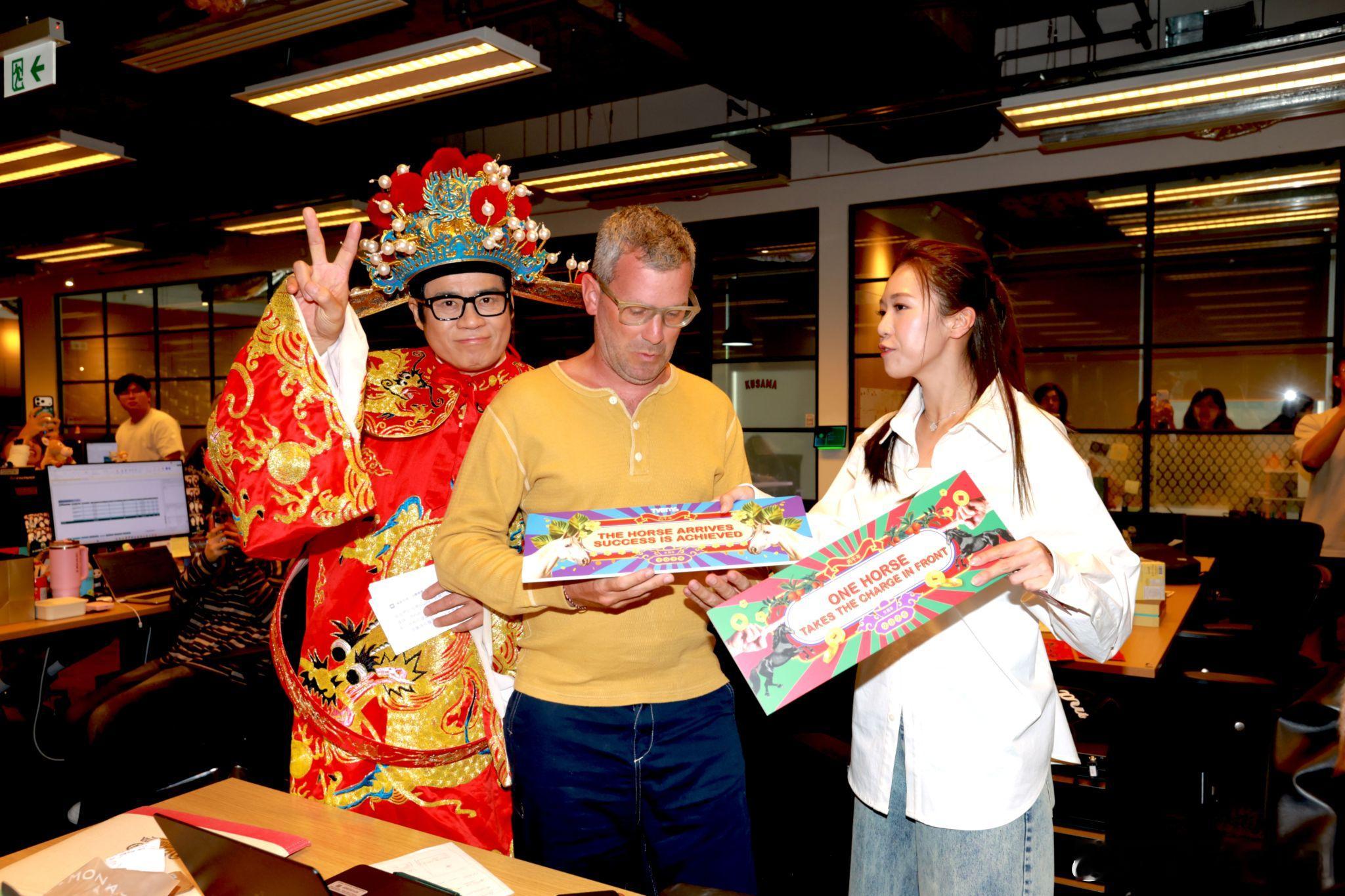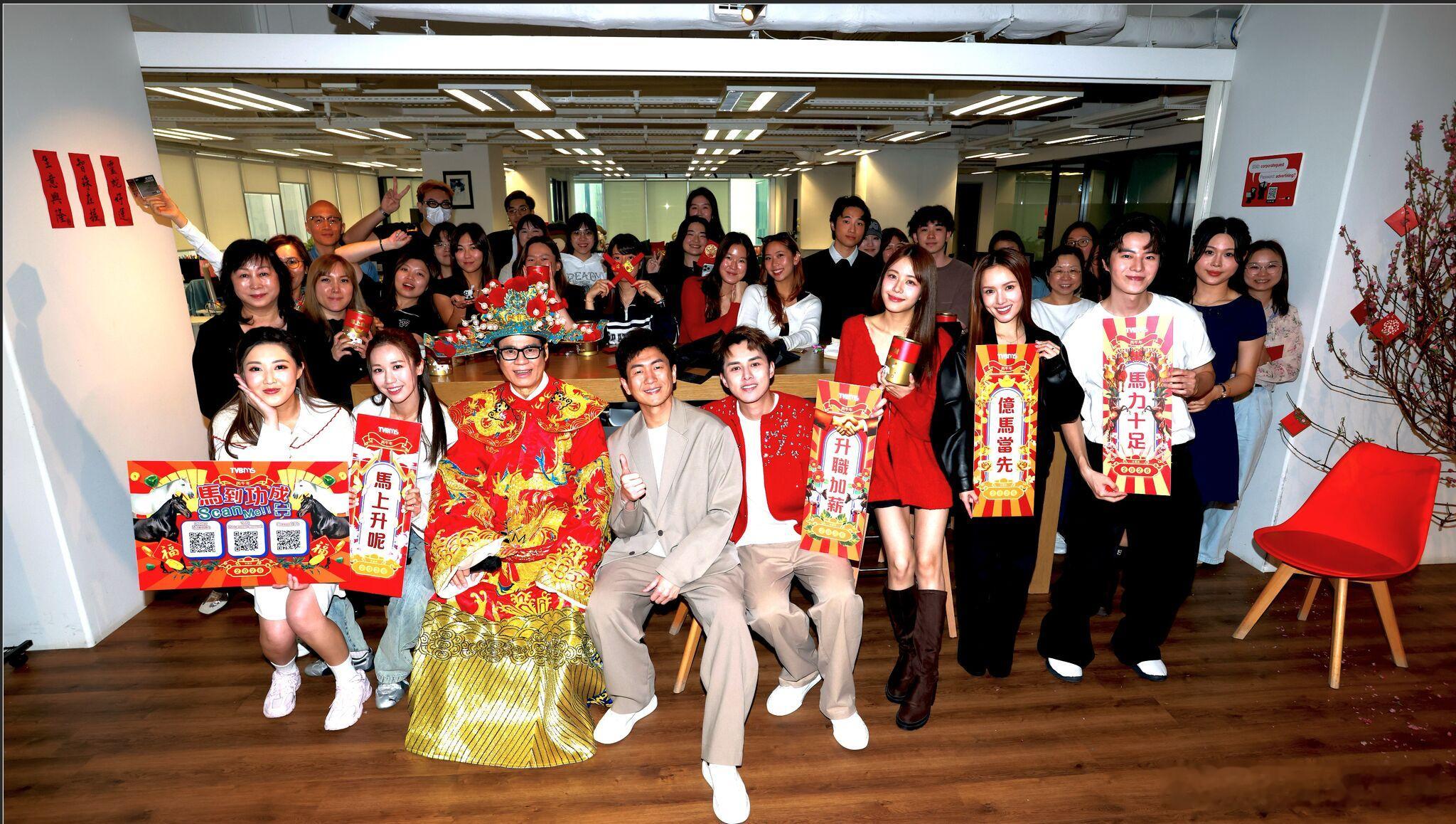 TVB馬年新春拜訪三大廣告公司 「大王」安德尊领军送福氣.TVB昨日展開農曆新年拜年活動,先後走訪三大廣告代理公司,與業界好友共慶新春,送上節日祝福。是次拜年活動別具聲勢,TVB特意派出大王安德尊化身財神,聯同何廣沛、馬貫東、林正峰、莊子璇、林秀怡、鄺潔楹、何沛珈等藝員一同出席。眾人在各公司現場與團隊互動遊戲,氣氛熱鬧歡騰,為辦公室增添濃厚節日喜慶。