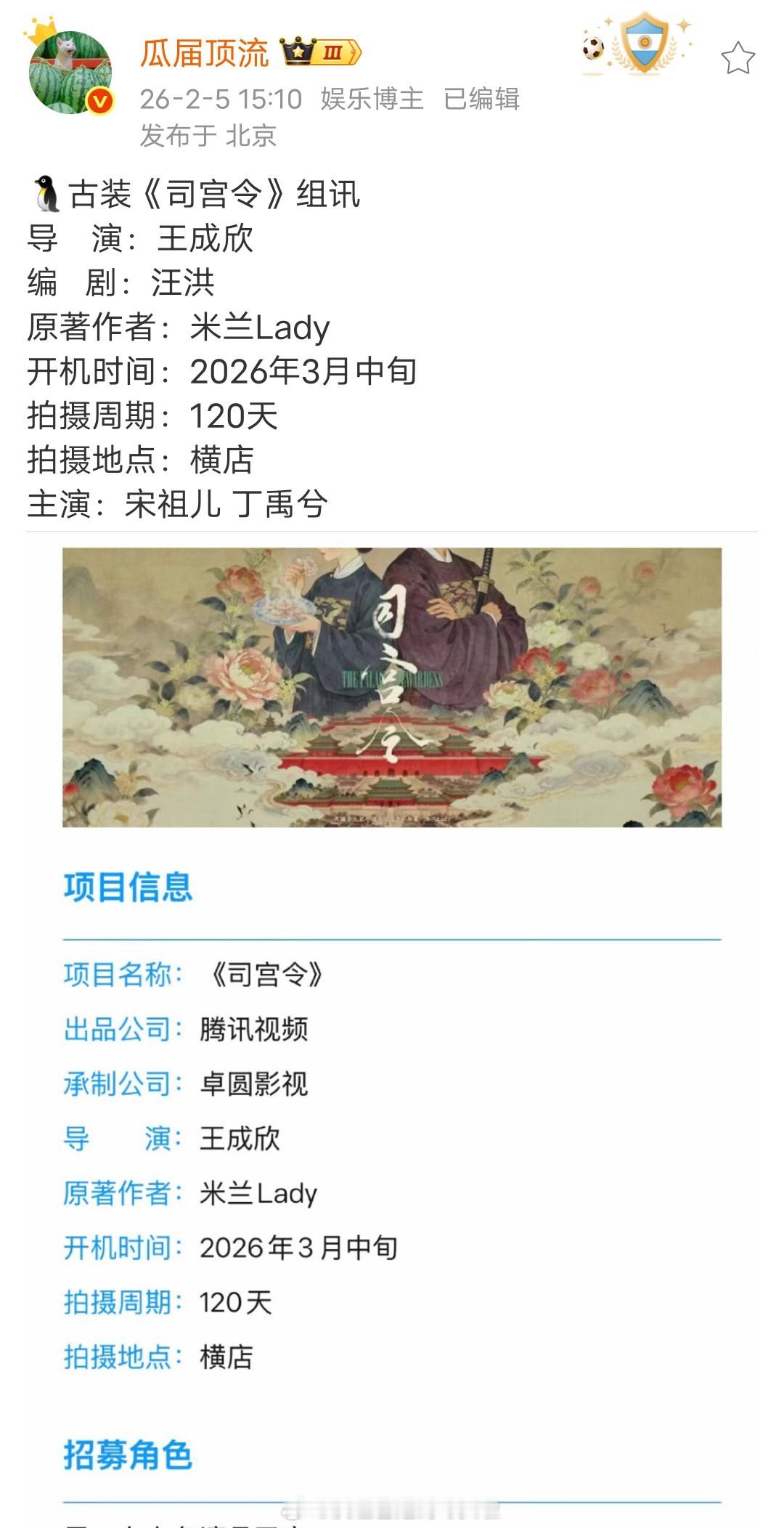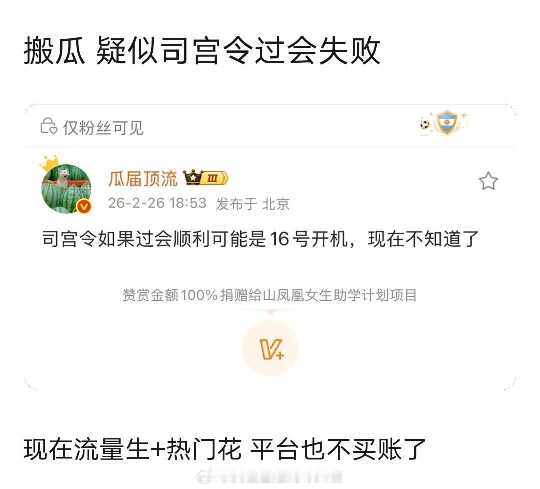 丁禹兮宋祖儿《司宫令》疑似过会失败?瓜主爆料如果一切顺利3月16号左右开机,好像都没有筹备置景的动静。流量生+热门花,现在平台也不买账了吗?