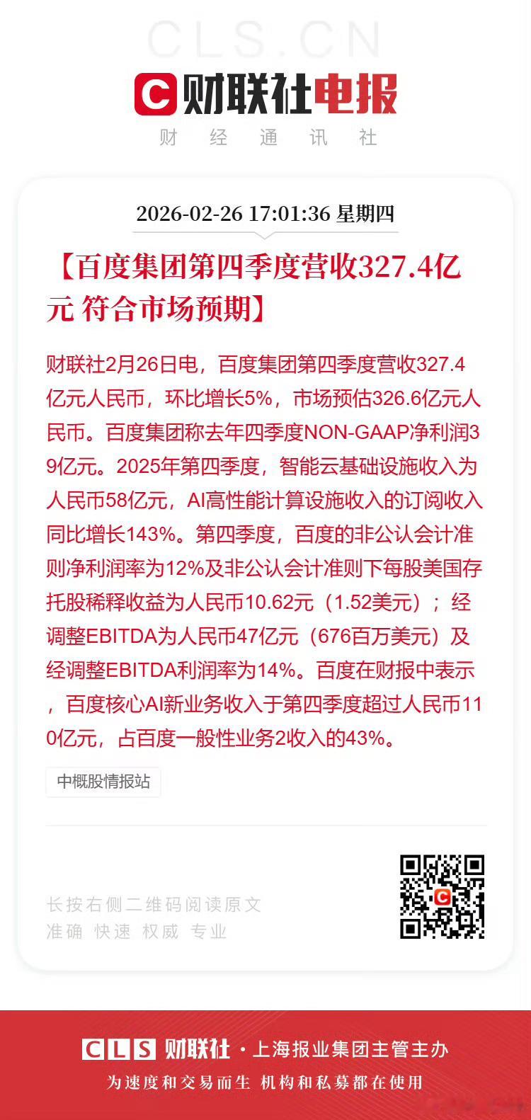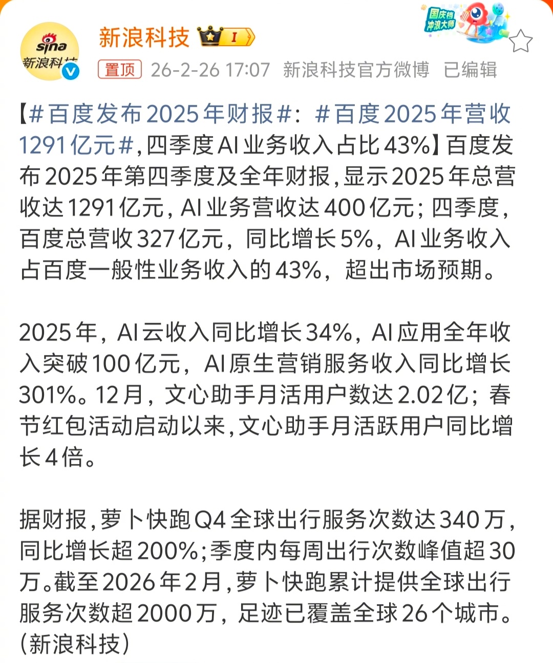 百度发布2025年财报 百度2025年净利润54.57亿元,较2024年的241.75亿元下降77.4%;经营现金流为-30亿元。