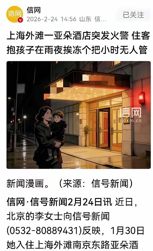 离大谱!上海母子雨夜冻僵 1 小时,千元豪宅变“冰窖”,酒店回应让人心寒透顶! 想象一下,你花了近 1500 元,带着年幼的孩子入住上海外滩的知名星级酒店,本想着享受魔都的繁华夜景和顶级服务。然而,深夜的一场突发火警,却将这场温馨的亲子游瞬间变成了噩梦。更令人匪夷所思的是,在长达近一个小时的惊魂时刻里,母子二人竟在冰冷的雨水中瑟瑟发抖,而号称“宾至如归”的酒店方,全程隐身,事后更是冷血回应。这究竟是人性的冷漠,还是管理的巨大黑洞? 事情发生在上海外滩的一家知名品牌大酒店。这位母亲为了让孩子玩得开心、住得舒适,特意挑选了这家地段绝佳、口碑不俗的酒店。当晚 10 点半,夜色已深,外滩的晚风带着几分凉意,母子俩早已进入梦乡。突然,一阵尖锐刺耳的火警警报声划破夜空,瞬间将熟睡的人们惊醒。 对于任何一位母亲来说,孩子的安全高于一切。听到警报的那一刻,这位妈妈的大脑一片空白,唯一的本能就是护着孩子逃生。慌乱之中,她根本来不及思考,更顾不上给孩子和自己添加衣物,抱着身穿单薄睡衣的孩子,跌跌撞撞地冲出了房间。 然而,冲出房门只是苦难的开始。此时外面正下着雨,冰冷的雨水夹杂着寒风,瞬间打湿了母子俩单薄的衣衫。当他们跟随其他惊慌失措的客人跑到室外空地时,眼前的景象让人心凉:空旷的雨地里,一群衣着单薄的客人无处躲藏,而整个过程中,竟然没有一名酒店工作人员出现! 没有引导疏散,没有维持秩序,没有一句安抚的话语。母子俩就像被遗弃的孤儿,在未知的恐惧中,跟着人群盲目地跑到了室外。这一等,就是整整一个小时! 这一个小时,对于成年人来说或许只是难熬,但对于一个穿着睡衣的孩子而言,简直是度秒如年。冰冷的雨水不断浇在身上,寒风像刀子一样刮过,孩子冻得嘴唇发紫,紧紧抱着妈妈,连哭泣的力气都没有了。周围是一片混乱与寒冷,而酒店的工作人员仿佛集体蒸发了一般。没人送上一把雨伞,没人递来一杯热水,甚至没人出来告知大家警报何时解除,是否安全。 当警报终于停止,母子俩拖着湿透的身体回到酒店时,整个人已经冻得瑟瑟发抖,脸色惨白,手脚僵硬。看着孩子可怜的模样,这位母亲心中充满了委屈与愤怒。她找到在岗的工作人员讨要说法:为什么没人疏导?为什么让客人在雨里冻这么久?为什么没有任何应急措施? 然而,酒店方的回应却比那夜的雨水更加让人心寒。面对质问,工作人员轻描淡写地表示:“只是误报,现在没事了,回房间吧。”当被追问为何无人管理、无人通知时,对方竟然两手一摊,推脱道:“经理不在,店长也不在。”那种事不关己、高高挂起的冷漠态度,仿佛在说:你们冻着了是你们的事,与我们无关。 火警无小事,即便是误报,也是对酒店应急管理能力的终极考验。一家收费近 1500 元一晚的知名品牌酒店,其核心价值不仅仅在于豪华的装修,更在于关键时刻能保障客人安全的完善流程和人性的关怀。在这起事件中,我们看到的却是管理的全面瘫痪和服务意识的极度缺失。 从警报响起到解除,整整一个小时的生命真空期,酒店方毫无作为。如果当时真的发生了火灾,这种混乱的疏散方式会造成怎样的后果?即便只是误报,让老人、孩子在雨夜中受冻一小时,难道不需要一个真诚的道歉和合理的解释吗?那句“领导不在”,不仅暴露了基层员工应急培训的匮乏,更折射出该酒店管理层的严重失职。 这件事迅速引发了网友的热议,大家纷纷指责酒店“店大欺客”、“冷血无情”。的确,金钱可以买到豪华的房间,但买不到在危难时刻的担当与温暖。这家酒店的做法,不仅寒了当事母子的心,更寒了所有消费者的心。 我们不禁要问:这样的服务,配得上“知名品牌”四个字吗?这样的管理,如何让客人安心入住?希望相关部门能介入调查,给受害者一个公正的说法,也给整个酒店行业敲响警钟:服务至上,绝不是一句空话;生命安全,容不得半点马虎!湖南母子坠河 杭州母子上海