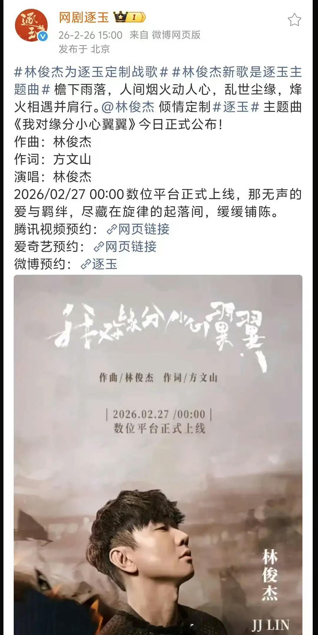 逐玉请来了林俊杰唱OST 我的天呐~24万的收藏,算大Ip还是小Ip? 逐玉经费都在ost上了吧…张凌赫田曦薇《逐玉》主题曲请到了林俊杰➕方文山,大咖阵容来看看逐玉看片repo:男帅女美。能get到cp感,cp粉和路人会喜欢的类型 好消息:男帅女美,cp好嗑坏消息:片子剧情后继无力 大家感觉逐玉集均至少达到多少才不算扑?逐玉buff加满了,逐玉开播我开学