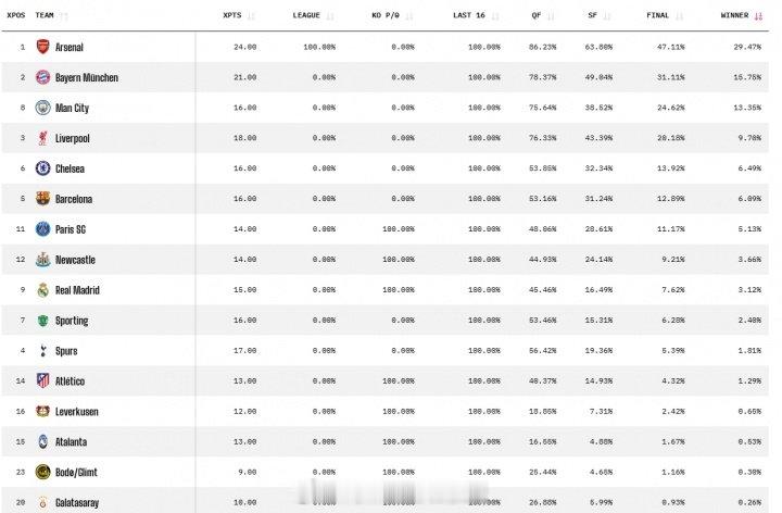 opta预测比赛欧冠夺冠概率:1-阿森纳 29.47%2-拜仁 15.75%3-曼城 13.35%4-利物浦 9.7%5-切尔西 6.49% 欧冠联赛 阿森纳著名教授