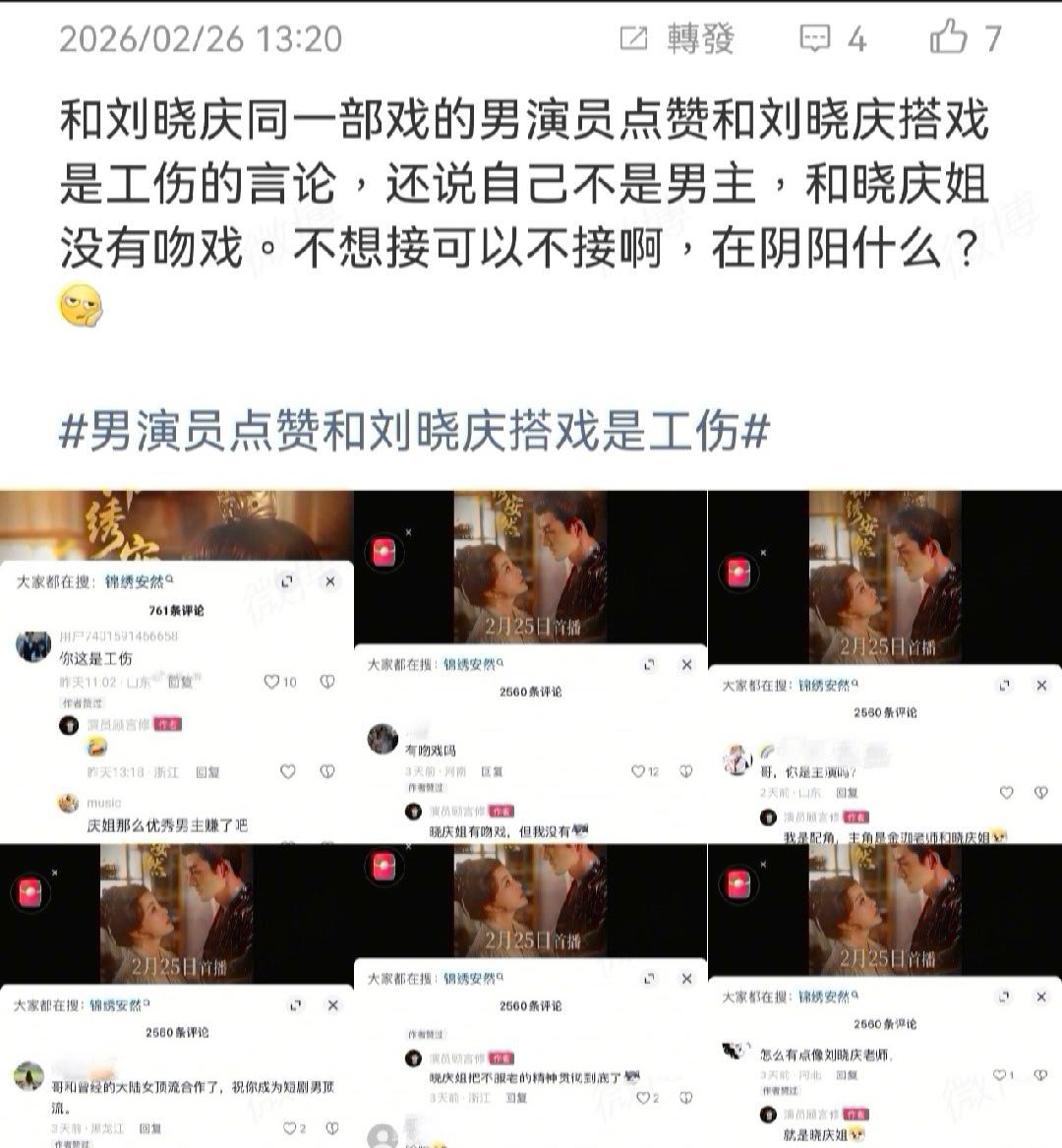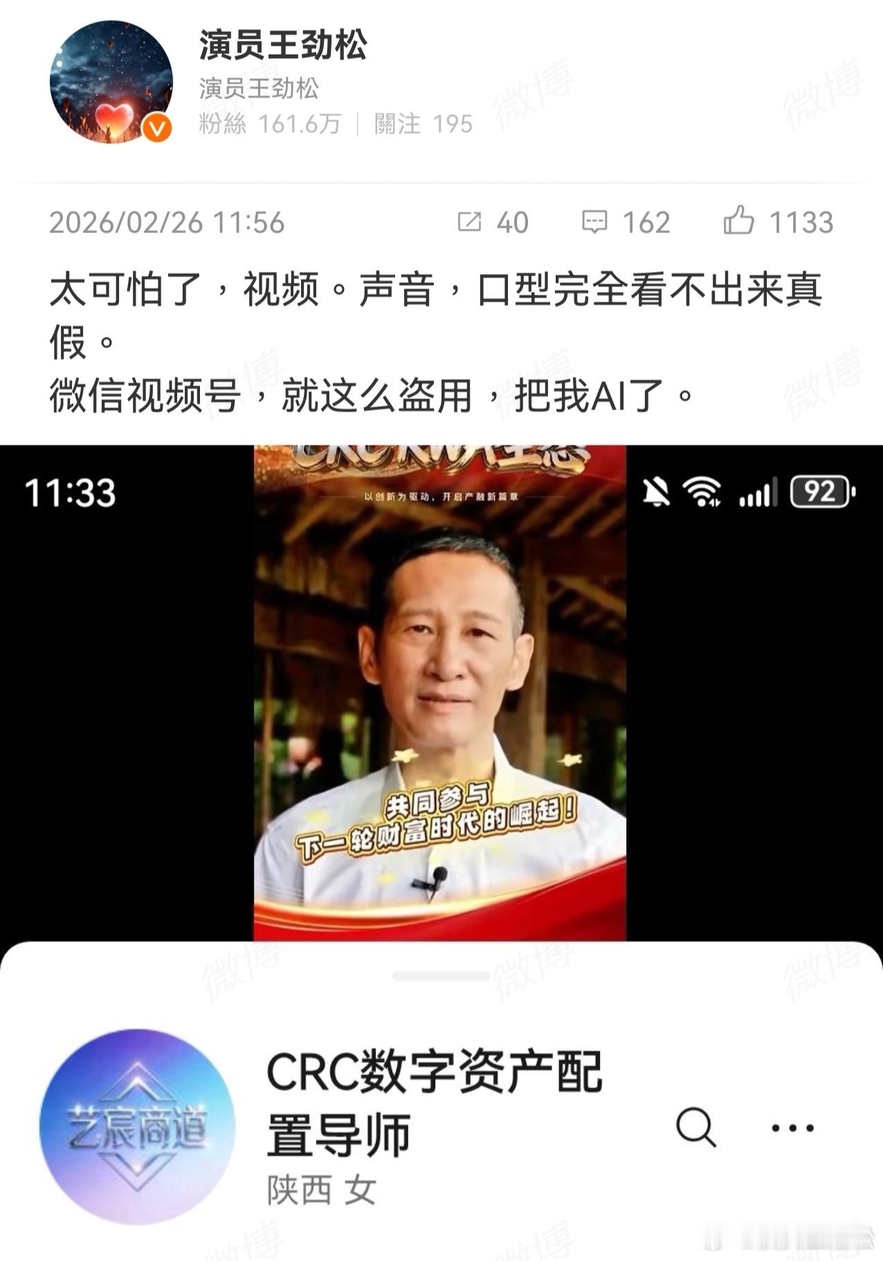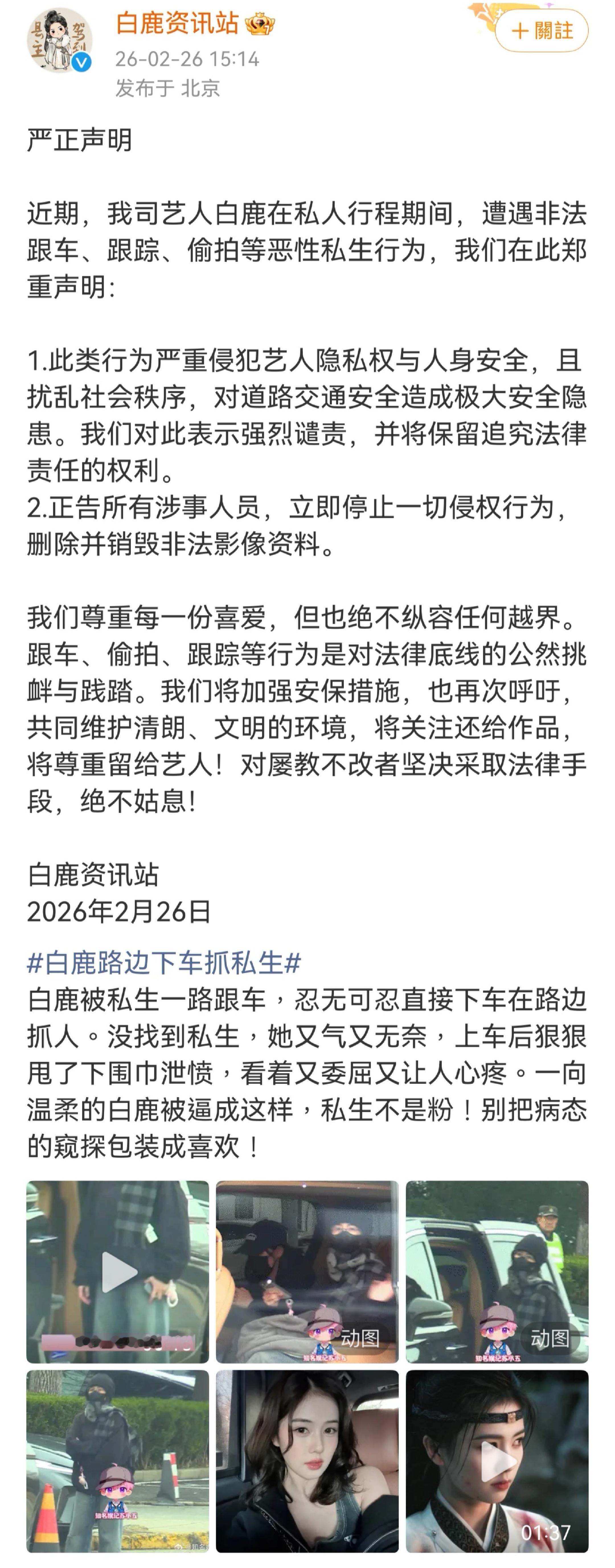 2026-02-26总结①唐宫奇案,官抖回应了账号打一星的情况:不是官方所为,不代表官方立场,正在联系抖平台进行排查 图1②英皇25周年群星演唱会官宣5月4日 图2③华策否认解散电影部门,在开发ai电影 图3④短剧,跟刘晓庆同剧组的男演员点赞和刘搭戏是工伤言论,还说他跟刘没吻戏 图4⑤王劲松控诉,微信视频号上出现由AI合成的伪造视频,其声音、口型与真人几乎完全一致,普通观众难以辨别真伪。图5⑥白鹿下车抓私生,白鹿方发文谴责非法跟车、跟踪、偷拍等恶性私生行为 图6