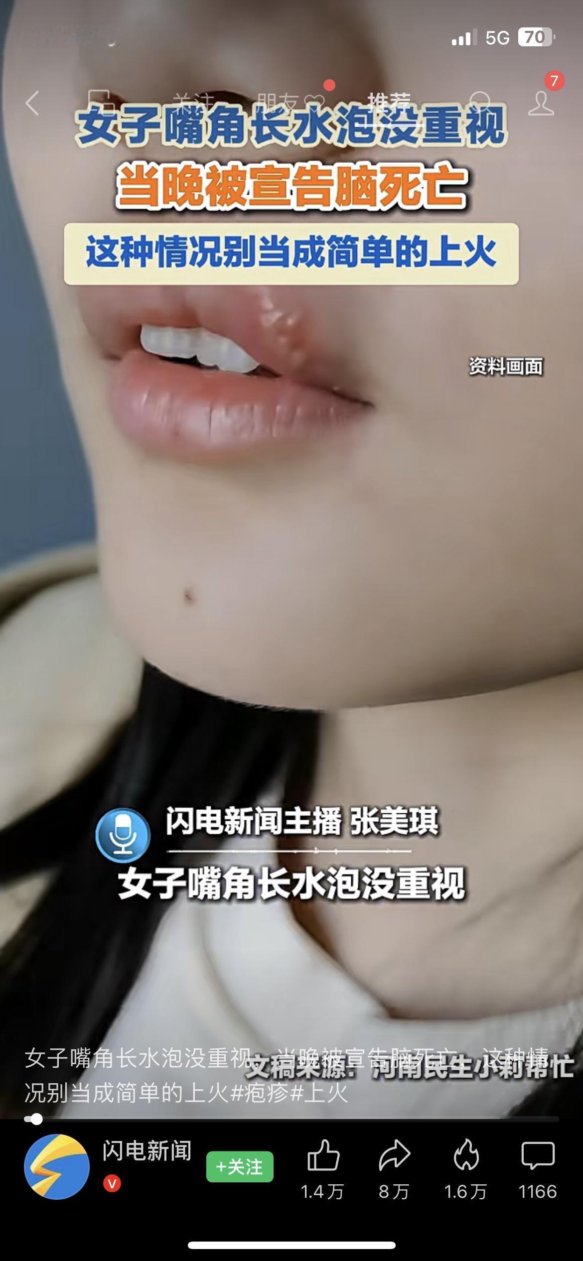 真的被这个案例吓到了!😨 千万别再把嘴角长水泡当成普通“上火”了! 据闪电新闻报道,陕西30多岁的张女士,嘴角长了一串水泡,她以为是上火,没放在心上。没想到,当晚她就被紧急送医,最终被确诊为疱疹性脑炎,宣告脑死亡。 我妈看完这个新闻,赶紧给我发微信,说她嘴角刚长了小疙瘩,吓得赶紧去医院检查。医生说,单纯疱疹病毒感染引发的脑炎,初期症状很容易和上火混淆,但一旦病毒侵犯脑部,病情进展极快。 提醒大家,嘴角出现成簇的水泡,伴随发热、头痛、呕吐,千万别硬扛,一定要立即就医!这不是危言耸听,是拿生命换来的教训。 你身边有人把嘴角水泡当上火硬扛的吗?赶紧转发提醒家人! 疱疹性脑炎 健康科普 上火 民生健康嘴巴起小泡泡