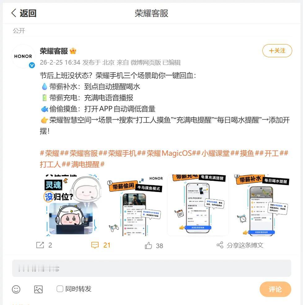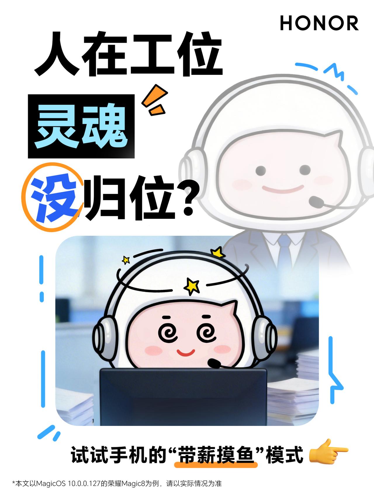 开工第一天,灵魂还在被窝里咋整?荣耀手机这波操作太懂打工人了!悄悄开启“打工人摸鱼模式”,追剧刷视频自动调低亮度、降低音量,老板路过也不慌。别小看这点细节,MagicOS连你的“社恐”都照顾到了。这才是真正的职场外挂,手机懂分寸,打工更从容。节后回血,从拒绝尴尬开始。