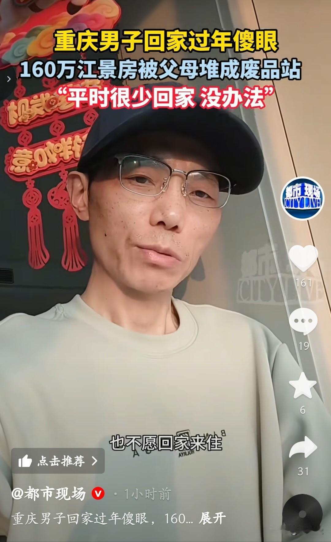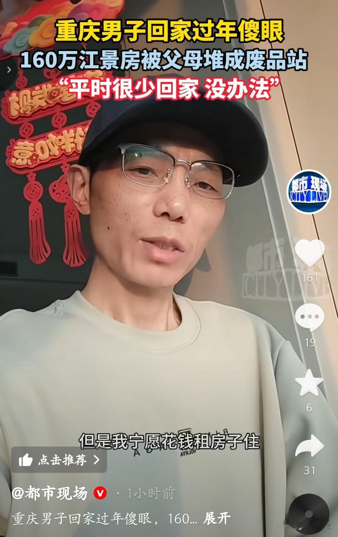 “我宁愿花钱出去租房子住,也不愿回家来住!” 这话出自一位花160万买下江景房的男主人,可这么好的房子,他却宁可在外租房也不愿回来住。 原因太让人无奈:房子被父母硬生生改成了“废品回收站”。卫生间里堆着6个废水桶,书房塞满杂物变成仓库,几千块买的甩干机被当成置物架,洗衣机放了3年都没正经用过。在父母眼里,这些别人看来的破烂,全是舍不得扔的宝贝。 好好的江景豪宅,住得憋屈又闹心。不是不孝顺,只是两代人生活观念差得太远,谁也没法轻易改变谁。只希望一家人能多些理解,别让好好的房子,寒了彼此的心。