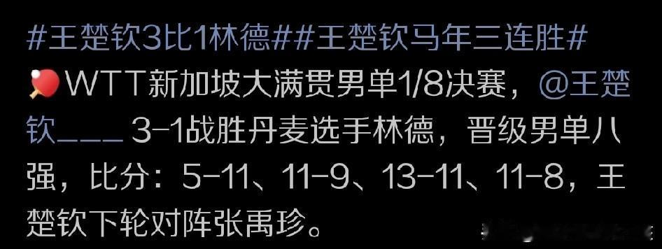 WTT新加坡大满贯赛的赛场上,在这个比赛日当中最晚登场的国乒主力王楚钦,作为现世界排名第一的男单球员,迎来了自己16进8争夺战的对手,来自丹麦的林德。 可以说,这位前一阶段就一直给王楚钦还有其他国乒主力带来很大竞争压力的欧洲球员,这一次又让王楚钦在比赛当中几度遇险,一方面是王楚钦第一局开局慢热,不适应对方的出手节奏,失误太多,直接输给对手。 然后是后三局当中双方的比分也一直非常胶着,而且第三局当中王楚钦还一度2:7落后,并让对方早早拿到多个局点,不过他在这一局当中还是打的非常顽强,后来居上逆转胜出并在第四局双方连续战成平局之后,局末连续发力打好关键分,实现了3:1的逆转胜出。双方四局的具体比分是5:11、11:9、13:11和11:8。 就像赛后采访环节,王楚钦谈到的那样,其实这场比赛,林德控节奏和不在常规节奏出手的打法特点还是让王楚钦遇到了很大的困难,也显得不够适应,场上失误很多,在比赛当中也几度遇险。 不过王楚钦这场比赛取胜的关键因素就在于自己虽然赢得非常侥幸,而且就像他自己说的,发挥也很一般,但是能做到的就是不乱打,心态保持稳定,一分分的去咬。特别是在第三局,很幸运的用这种不放弃的心态和状态,给咬下来了,最后就稳住了心态,也稳定住了战术和心理,让对方在场上出现了心态乱了之后的出手不合理,最终也让王楚钦实现了3:1的胜出。 而当现场记者问起王楚钦对于下一轮比赛,也就是16进8争夺战,与来自韩国的高手张禹珍之间的交手会有怎样的预测时,王楚钦提到两个人是对手,也是好朋友。同时他认为对方的实力还是非常突出的,而且16进8争夺战当中,张禹珍还胜了近期状态神勇,不断提升个人能力和排名的日本新星松岛辉空,所以说张禹珍目前的状态有多好也是可见一斑。 对于下一轮双方的正面交手,王楚钦直言自己要做好自己,并全力以赴,对比赛做足困难准备,然后充分去享受比赛。我们也相信王楚钦在这一轮的比赛当中侥幸获胜之后,一定能让自己的比赛心理和技术状态再有一个新的提升,并在张禹珍面前全力展示自己的竞争力,力争一场关键胜利并全力去拼下一个男单四强名额。让我们再次恭喜王楚钦!