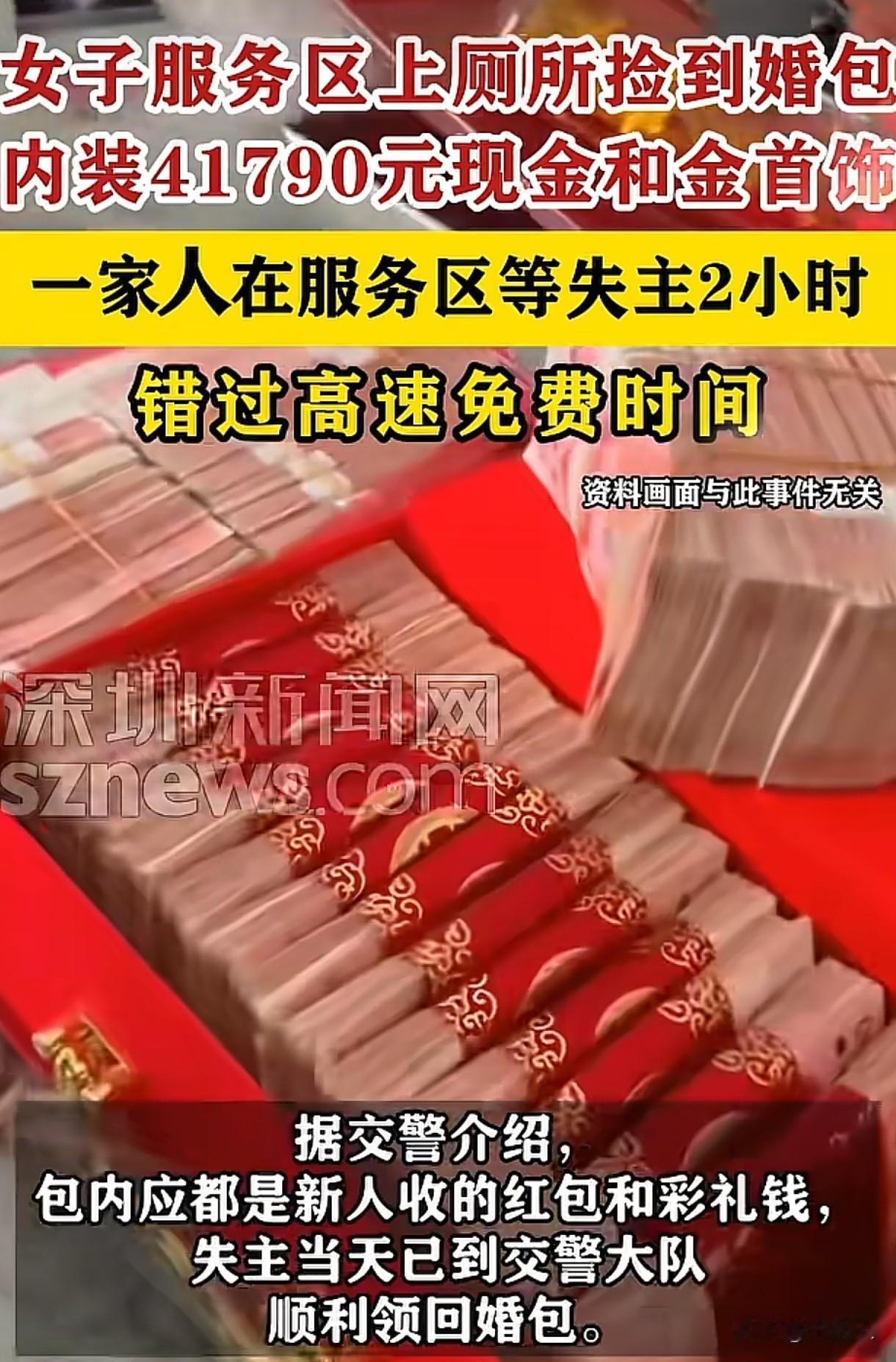 江西南昌,女子在服务区上厕所时,捡到一个红色的婚包,里面装了4万多现金和一些金首饰。女子一家在服务区等了失主2个小时,为此错过高速免费通行时间,付了几百元过路费,可女子哥哥却说:我们不后悔,失主肯定更着急。网友:失主可以把高速费给好心人,这是做人的根本。 2月23日,大年初七,这本是一个热热闹闹、走亲访友或者返程上班的好日子,叶先生带着妹妹,还有其他家人开开心心出行。一路上,大家有说有笑,很是开心。 妹妹说要上厕所,叶先生就把车开进了进贤服务区。 可没想到,妹妹竟然在厕所里意外捡到了一个红色的婚包。 他们打开看了一眼,发现里面装了好多现金,还有一些首饰和照片,但是里面没有联系方式。 他们想着这应该是一对新人留下的,丢了这么多钱,对方肯定也很着急。 商量之后,他们决定把包拿到厕所外面去等,叶先生也支持妹妹的决定。 一家人就这样在服务区等了2个小时,可失主始终没有出现。 一直没有等到失主,叶先生一家觉得这样等下去也不是办法,最终选择把婚包交给了交警大队,让交警帮忙寻找失主。 后来,据交警介绍,这包里的东西是新人收的红包和彩礼钱,当天,失主就来到了交警大队,顺利领回了自己的婚包,婚包里有41790元现金和一些金首饰。 初七那天高速是免费通行的,因为这件事情,叶先生他们一家在服务区耽搁了2个多小时,最终错过了高速免费通行时间,付了几百元的过路费。 不过,他们一点都不后悔,比起他们,失主应该更着急。 有人说:失主可以把高速费给好心人,这是做人的根本。 我手机掉了,用朋友的手机打过去,有人捡了,让我去他家拿,得知他家里有老人,我就买了礼品,又拿了200元给老人,大家都很开心。 也有网友分享了自己不愉快的经历:在服务区休息上厕所,出去的时候,有人把路堵了,自己就上去提醒驾驶员,麻烦他往后面退一点,驾驶员不动,副驾驶下来一个女人,手镯掉了,她没看到,我好心提醒,对方捡起来,连声谢都没说就往厕所走了,再次提醒驾驶员让一点,可对方还是不动,顿时就觉得善良给错了人。 相比之下,叶先生一家为了归还婚包,在现场等了2个小时,就连错过了高速免费时间,也没后悔,这种拾金不昧的精神,让我们看到了人性的善良。 拾金不昧是美德,更是法律义务。 《民法典》第314条规定:拾得遗失物,应当返还权利人。拾得人应当及时通知权利人领取,或者送交公安等有关部门。 叶先生一家捡到婚包后,有义务把包归还给失主,或者交给有关部门,他们选择在服务区等待失主,后来又交给交警大队,这种做法是完全符合法律规定的。 叶先生一家因为等待失主错过了高速免费通行时间,付了几百元的过路费,那么,失主有没有义务支付这笔费用呢? 从法律上来说,这并没有明确的强制性规定。 《民法典》第317条规定:权利人领取遗失物时,应当向拾得人或者有关部门支付保管遗失物等支出的必要费用。 权利人悬赏寻找遗失物的,领取遗失物时应当按照承诺履行义务。 也就是说,如果失主有承诺,替她保管物品,她可以支付一些费用或者叶先生一家因保管物品,产生了一些必要费用,那么失主是需要按照承诺履行义务的。 但是实际上,叶先生一家捡到这个包后,是自愿留在原地等待失主的,由此错过了高速免费通行时间,因此这笔过路费是不能要求失主给付的。 但是如果失主出于感恩,把这笔钱付了,那这也是一种善意。 在生活中,有些东西比金钱更珍贵,那就是人与人之间的真情和善良。 捡到东西,及时归还给失主,说不定一个小小的举动,就能给别人带来大大的温暖。 同时,当别人帮助了我们,我们也要懂得感恩。 对于此事,大家怎么看?
