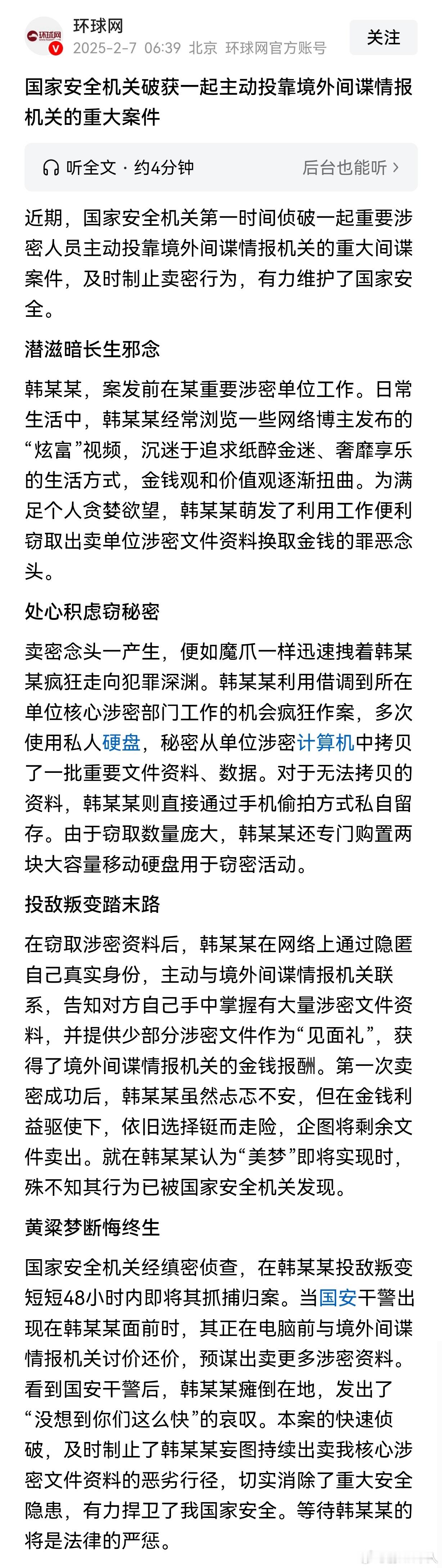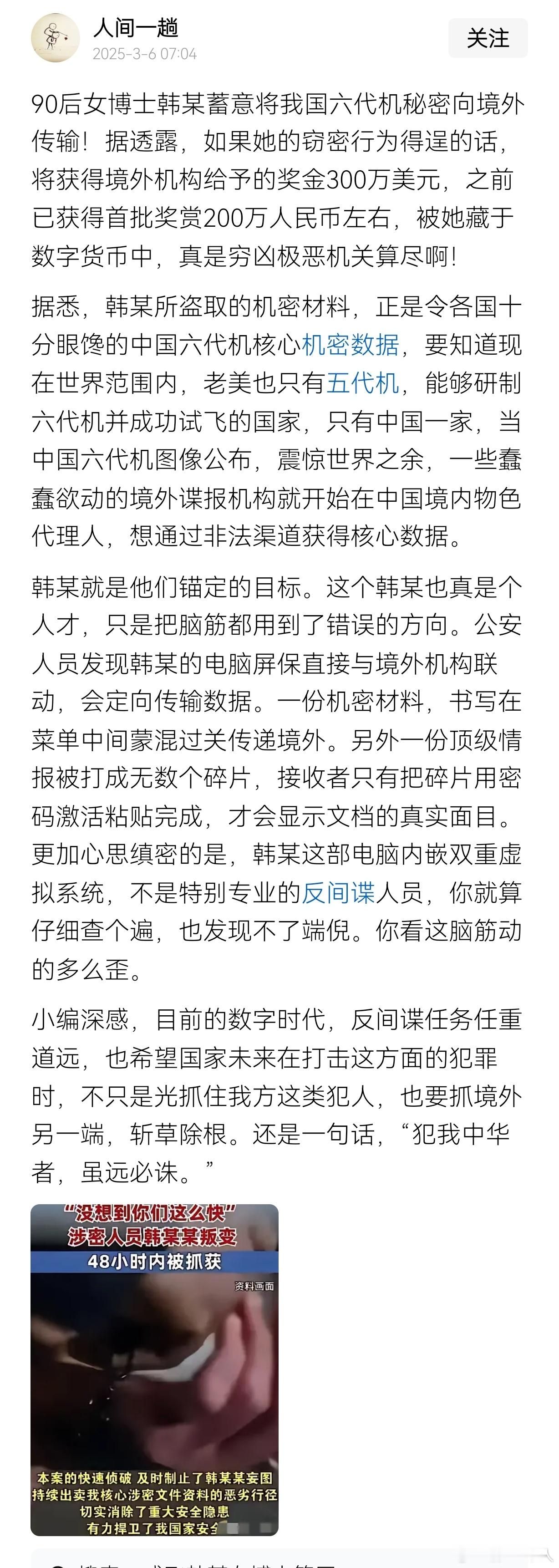 惊蛰无声背后故事原型之一:有网友说90后女博士韩某蓄意将我国六代机秘密向境外传输!据透露,如果她的窃密行为得逞的话,将获得境外机构给予的奖金300万美元,之前已获得首批奖赏200万人民币左右,被她藏于数字货币中,真是穷凶极恶机关算尽啊!
