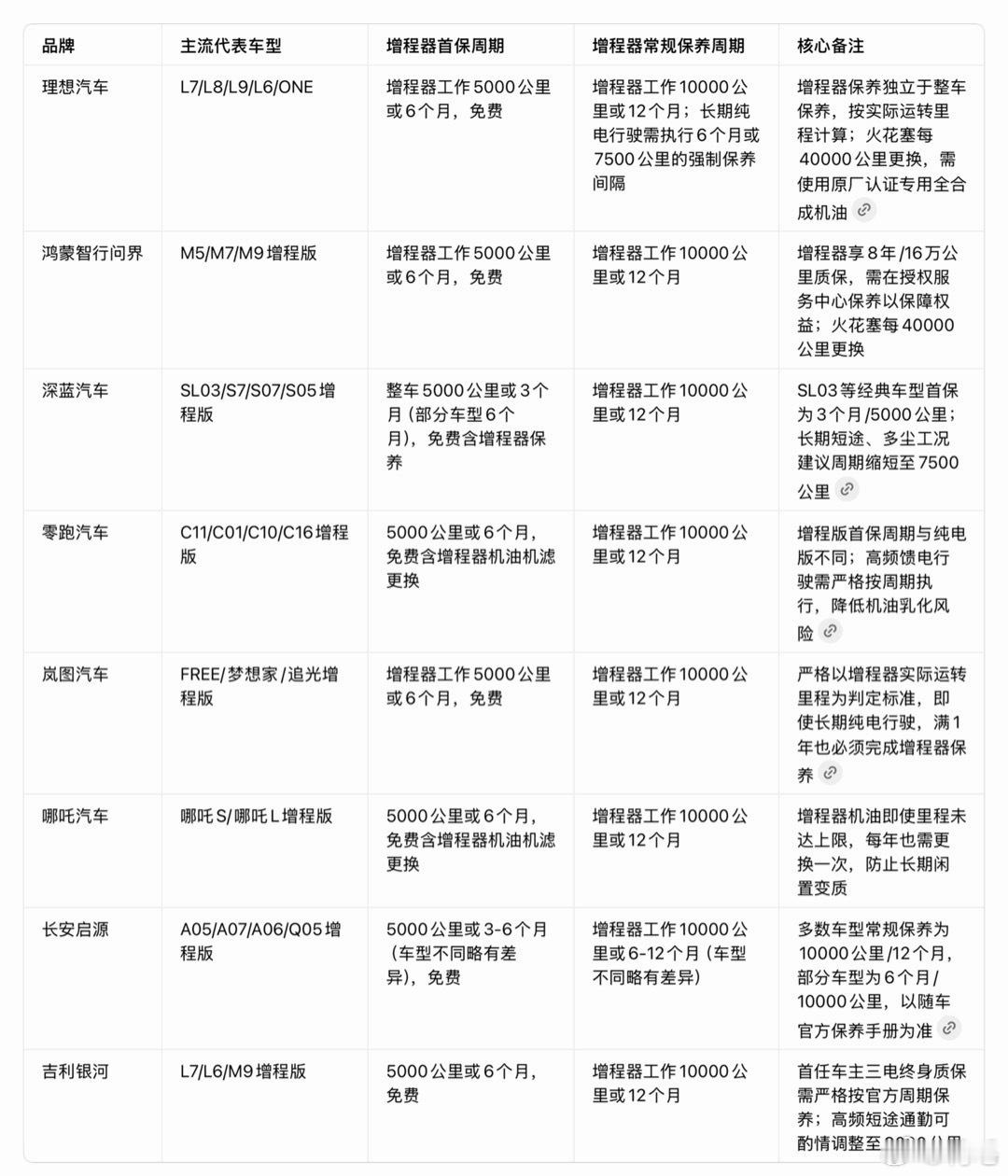 顺便让AI整理了一下,主流增程车里,基本上常规保养周期就没有超过1年10000km的……