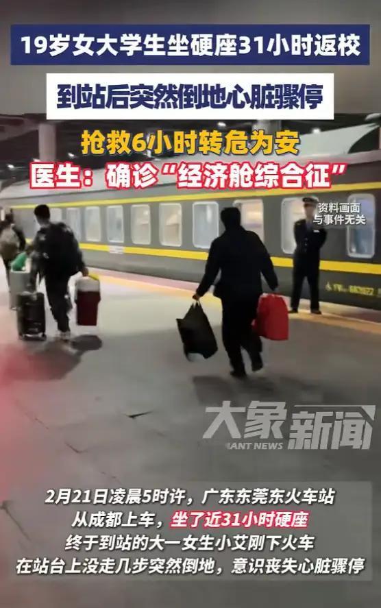 19岁女大学生坐硬座31小时返校,到站后突然倒地心脏骤停,医生:确诊“经济舱综合征”。 【19岁女孩奔波31小时硬座归来,犹如“经济舱综合征”击倒她:我们该如何守护年轻人的生命?】 每年春节,归途成了几亿人的共同记忆:车站人潮汹涌、长途奔波的疲惫、思乡的情感交织成一幅温暖又现实的画卷。然而,正是在这份温馨背后,却隐藏着一场令人扼腕的生命危机——19岁的大学新生小艾,用生命在告诉我们:长途旅行,绝不仅仅是疲惫那么简单。 她,带着满腔的期待,从成都啃了近31小时的硬座,赶回东莞开学。或许有人会说,这只是学生的“常态”,但谁又能想到,一个看似普通的旅程,会成为她生命的转折点?在火车站的那一瞬间,小艾突然倒地,心脏骤停!只因“经济舱综合征”——这个陌生又令人惶恐的词,正悄然侵蚀着我们身边的年轻人。 你可曾想过?一个20岁的生命,竟会因为“劳累、缺水、作息紊乱”,在归途的终点失去呼吸。这不禁让人深思:我们在追赶时间的脚步中,是否已经忽视了身体的最基本需求?长途奔波、疲惫不堪,是否已成为“隐形杀手”?更令人心碎的是,小艾出发前已持续胸闷两天,却还选择硬着头皮上火车,只为了不耽误开学的时间。 这段经历,像极了我们生活的缩影。现代社会的快节奏,让许多人忽略了身体的信号:一声胸闷、一点乏力,或许就是疾病的前兆。尤其是在春节返乡、春运高峰时段,长时间的久坐、少喝水、作息不规律,成为心血管疾病的“帮凶”。 但更令人愤怒的,是我们对生命的忽视!在追逐梦想、返乡团聚的同时,是否该给自己多几分关爱?或许我们需要像对待亲人一样,呵护自己脆弱的身体。长途旅行,除了准备行李,更要带上健康的“安全意识”。喝水、休息、合理作息,才是保障生命的最基本保障。 这起事故,也让我们反思:在大数据、智能科技日益发达的今天,为什么依然有那么多生命在路途中悄然逝去?因为“忽视”是最大的杀手。我们要不要从今天起,给自己一个承诺:在奔波中,也要善待自己?在追梦途中,不要让健康成为“最后的底线”。 最后,愿每一位在路上的你我,都能听见自己身体的声音。愿小艾的故事成为警钟,唤醒那些仍在疲惫中迷失的心。生命只有一次,别让“忙碌”成为死亡的借口。让我们从现在开始,学会关爱自己,守护生命的每一秒。 因为,生命的价值,远比任何目标都重要。