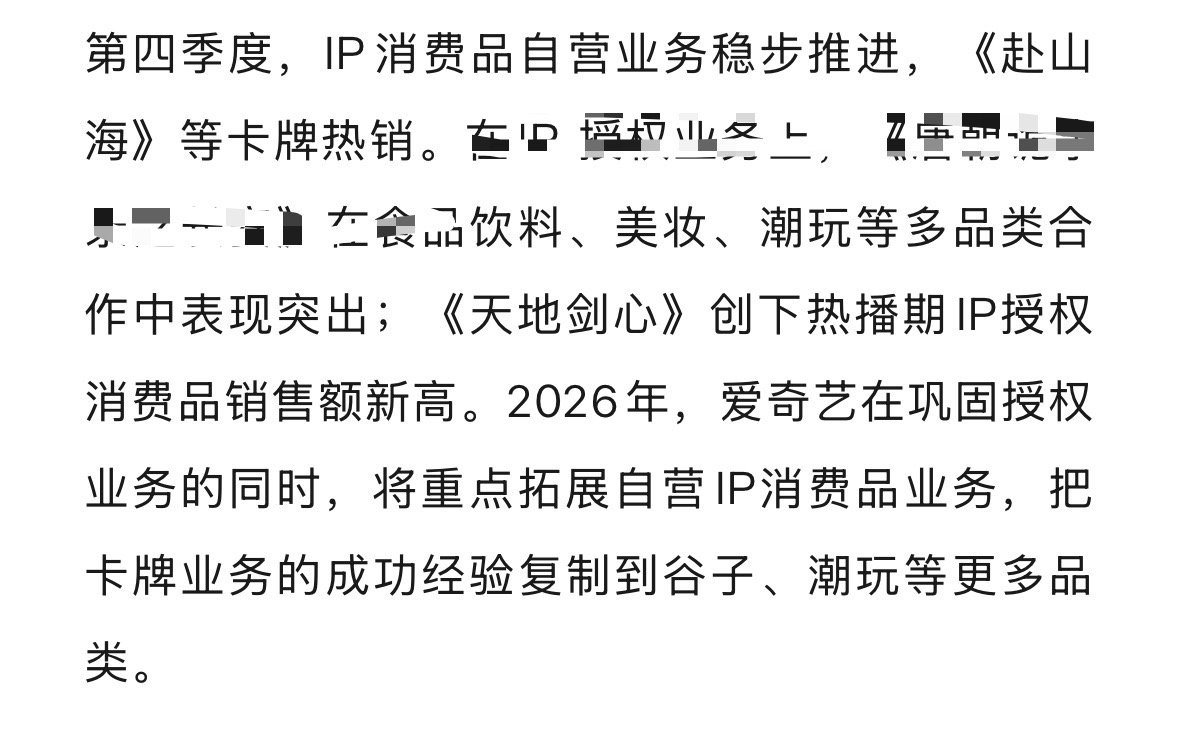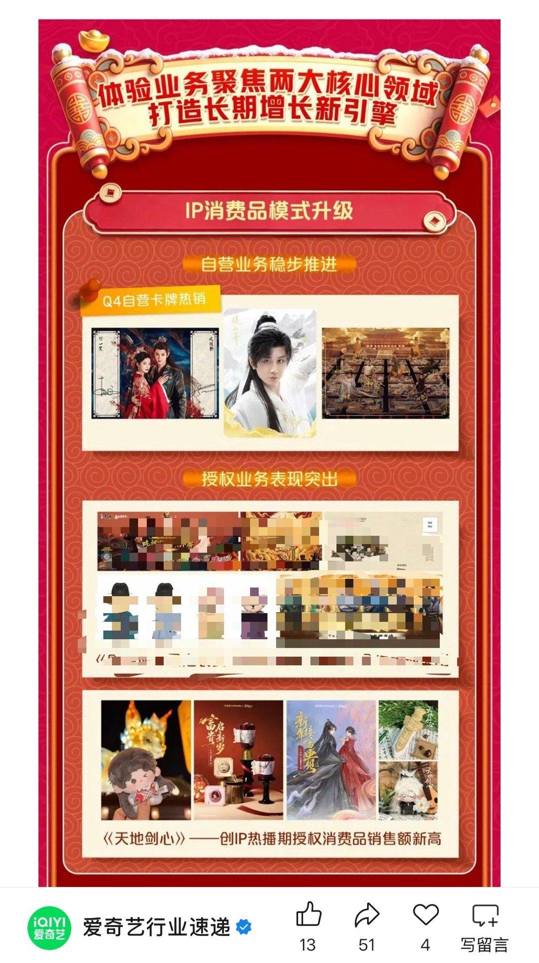 爱奇艺Q4财报:成毅赴山海卡牌热销,天地剑心创下热播期ip授权消费品销售额新高。