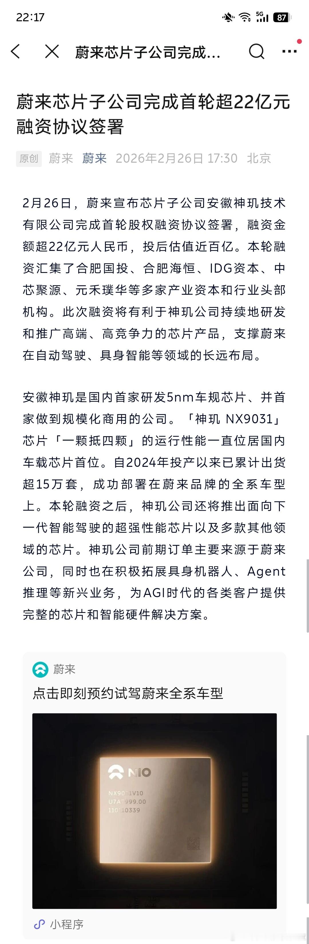 今天蔚来官方公众号公布蔚来宣布芯片子公司安徽神玑技术有限公司完成首轮股权融资协议签署