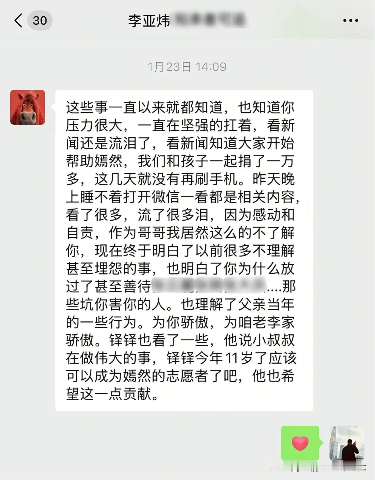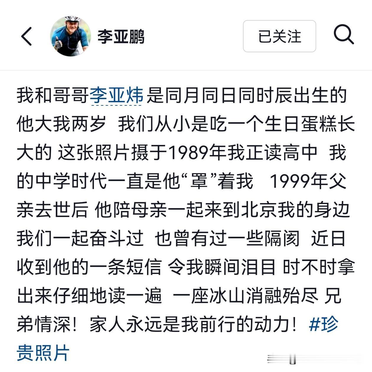 李亚鹏和哥哥李亚炜有隔阂原来是真的,虽算不上“反目成仇”,但也疏离得“形同陌路”。原因是当年一起投资雪山艺术小镇,项目失利,李亚鹏背上巨额债务,哥哥也被牵连其中。 两人面对巨大压力、互相不理解,慢慢越走越远,很多年都很少联系。从曾经并肩奋斗的兄弟,变成“最熟悉的陌生人”,实在让人唏嘘。 而今天李亚鹏更新视频,晒出与哥哥的对话,彻底解开了多年的心结。哥哥在信息里说:现在终于明白了以前很多不理解甚至埋怨的事!他还带着孩子为嫣然捐款,支持弟弟做的公益。 其中一句“为你骄傲,为咱老李家骄傲”,让人感动,也胜过所有解释。 年少时你为我撑腰, 中年后我为你兜底。 这才是最让人破防的手足情深。