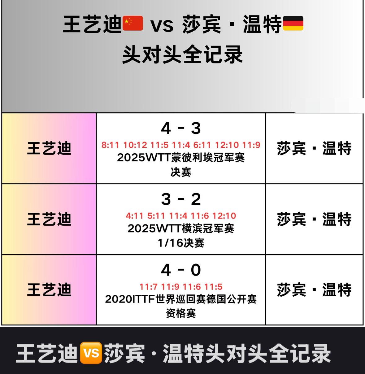 王艺迪与温特的头对头全记录——新加坡大满贯女单1/8对阵 王艺迪VS温特! 2月26日新加坡大满贯, 王艺迪3:1伊藤美诚晋级8强! 温特3:1朱雨玲,晋级8强! 温特状态特别爆燃, 自从温特换胶皮后, 成绩突飞猛进, 成为欧洲一姐,拿下欧洲杯冠军🏆! 从以往两个人的交手记录来看, 王艺迪对温特保持三战皆胜的历史优势战绩! 最近一次交手是在2025年 蒙彼利埃冠军赛女单决赛中, 王艺迪4:3温特, 打到决胜局,二分优势, 非常危险的比赛! 新加坡大满贯1/4决赛, 两个人再次重逢, 胜负难料, 相信大迪, 加油!