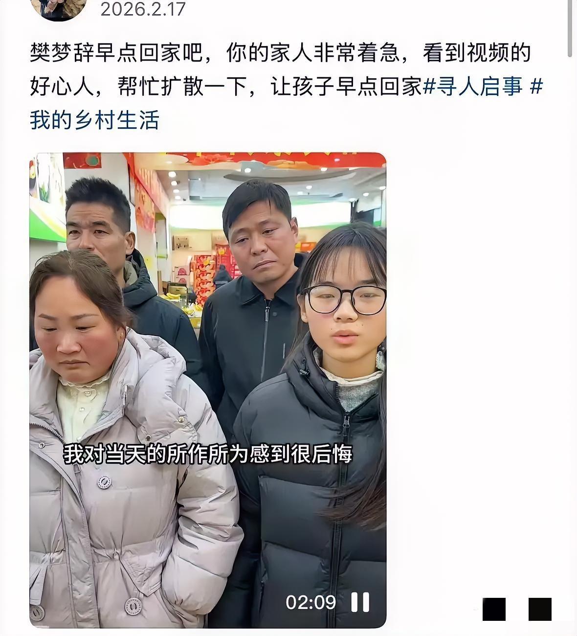 离家出走的15岁女孩樊梦辞的遗体在一处水域里被找到了!过小年那天,她因和家人发生矛盾离开了家门。整整半个月的时间里,家里人都快急疯了。可没想到,最终还是等来了这样的结局! 樊梦辞,出生于2011年,河南项城丁集镇人。她的父母生育了三个孩子,她是家中老二,上有一个同龄的姐姐,下有一个弟弟。 这条消息传来,让无数关注此事的网友感到心痛,一条年轻的生命就此画上了句号。 樊梦辞年仅15岁,正值青春年少,还未来得及好好感受生活,就以这样的方式离开人世。 她因与家人产生矛盾选择离家出走,这半个月里,家人四处寻找,始终没有任何音讯。 多日的等待与期盼,最终换来的却是最让人无法接受的结果,这份打击对整个家庭而言是毁灭性的。 作为家中的第二个孩子,樊梦辞处在姐姐与弟弟之间,这样的家庭位置往往容易被家人忽略感受。 青春期的孩子内心敏感脆弱,情绪波动大,一次争执就可能让他们陷入无助与绝望之中。 很多家长常常忽视孩子的心理变化,把孩子的情绪当成无理取闹,缺少必要的沟通与理解。 类似因家庭矛盾引发的青少年悲剧,近年来并不少见,每一次都在给所有家长敲响警钟。 孩子的心理健康,远比我们想象的更加重要,沟通和包容,才是守护孩子最关键的方式。 一时的矛盾与争吵,不该成为夺走孩子生命的推手,遗憾的是,这份道理明白时往往已经太晚。 樊梦辞的离开,是一个家庭的悲剧,也值得每一个有孩子的家庭深刻反思。 各位读者你们怎么看?欢迎在评论区讨论。