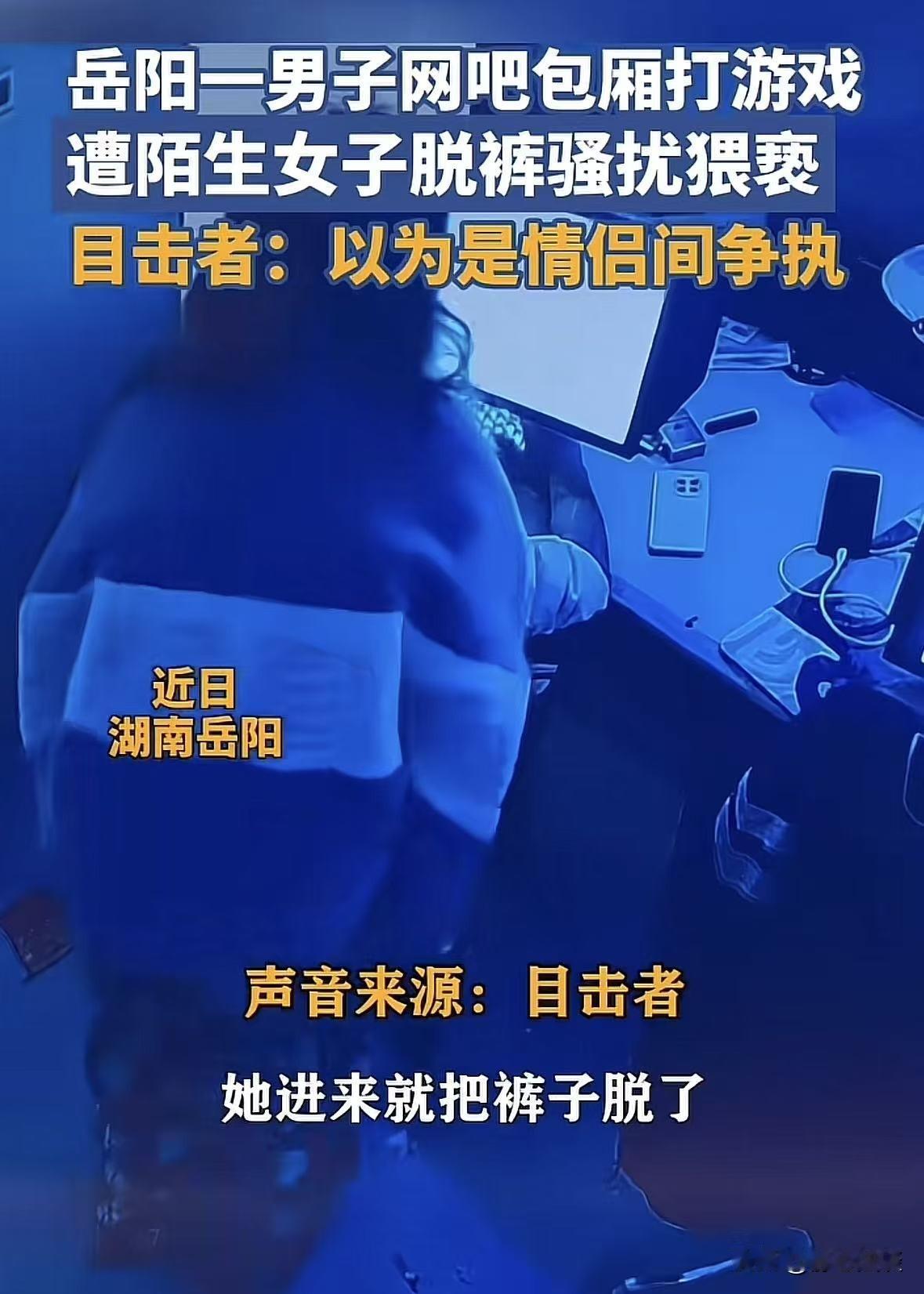 湖南岳阳,男子在网吧包间上网,一醉酒女子突然闯入,可男子在打游戏并未注意到,谁知女子进来就把裤子脱掉,随后拿了一把凳子坐在男子旁边,直接把腿放到他的腿上,手也跟着乱摸,男子愣了一下,反应过来赶紧起身,可女子薅住男子不撒手,还要把他的衣服脱掉,男子吓坏了大喊救命,后来网吧工作人员发现不对劲,费好大劲才把女子控制住,男子赶紧报警。网友:头一次见到女的耍流 氓,男孩子在外也要保护好自己! 2月24日下午,小伙戴着耳机玩得正上头,键盘敲得噼啪响,眼睛死钉在屏幕上,连包间门被推开都没察觉。 还以为是网吧服务员来送水,或者是隔壁的客人路过,压根没往心里去。 可他万万没想到,走进来的根本不是熟人,而是一个二十出头的陌生女子。 眼神发直,一身酒味,进来以后一句话没说,站在他旁边就往下扯裤子,动作又快又野。 小伙此时并未察觉,就觉得后面有人,余光一扫,当场脑子“嗡”的一下,整个人直接僵在椅子上。 那一瞬间他甚至怀疑自己看花了眼,大脑一片空白,完全不知道该躲还是该喊。 游戏里的角色都原地不动被人攻击,他却顾不上了,彻底懵圈,根本不知道该作何反应。 没等他反应过来,女子转身出去搬了把塑料椅,在他旁边一屁股坐下,然后就把腿往他身上架,手还不安分地乱摸。 直到这时候,小伙才反应过来,自己怕不是遇上女酒鬼。 他吓得猛地起身,想要逃走,结果女子一看小伙要跑,立马伸手死死薅住他的胳膊,说什么都不撒手。 甚至手脚并用缠上来,想要脱他的衣服,嘴里还嘟囔着乱七八糟、让人听不懂的醉话,整个人状态十分癫疯狂。 小伙被拽得动弹不得,又怕又怒又恶心,脸都白了,扯着嗓子大喊:你干什么,放开。 他一边挣扎一边往后躲,可女子力气极大,加上喝了酒情绪亢奋,他根本挣脱不开。 旁边看热闹的一开始还以为是小情侣闹别扭,抱着胳膊看热闹,听见救命声才慌了神。 网吧的工作人员听见吵闹赶紧过来,费了好大劲才把女子拉开,按住她不让再靠近小伙。 小伙浑身发抖,衣服被扯得皱巴巴的,耳机掉在地上,屏幕里的游戏早就结束了,可他心里的后怕还没停。 他站在角落大口喘气,脸色苍白,眼神里全是惊魂未定,长这么大从没遇到过这么离谱又可怕的事。 缓了好半天,他才拿出手机报警,吓的手指都按不准号码。 缓了好半天,他才拿出手机报警,吓的手指都按不准号码。 而这件离谱的事,也很快被传到了网上,瞬间引爆了网友的评论区,大家吵得热火朝天,看法也是五花八门。 有人开玩笑,头一次见到女的这么耍流氓,真是大开眼界! 不过小伙肯定太帅了,才让女子情不自禁。 可不少人表示,这哪是艳福,纯纯噩梦,换谁都得吓懵! 这也就是女的,要是男的对女的这样,早骂上天了,凭啥男的受害就被调侃? 还有人不少人表示:真别笑,男孩子在外也要保护好自己,骚扰不分男女。 《治安管理处罚法》第44条:猥谢他人的,或者在公共场所故意裸露身体,情节恶劣的,处五日以上十日以下拘留。 也就是说不管男女,只要违背对方意愿,用肢体、动作进行猥 亵都属于违法。 该女子强行脱裤、乱摸、拖拽,已构成猥 亵他人,警方可依法拘留罚款。 截至目前女子被带走,事情还在调查中。 可那天包间里的情景成了在场所有人心里,挥之不去的荒诞又吓人的一幕。 对此,你怎们看这件事! @静心法谈 学法辨是非,慬法不吃亏。