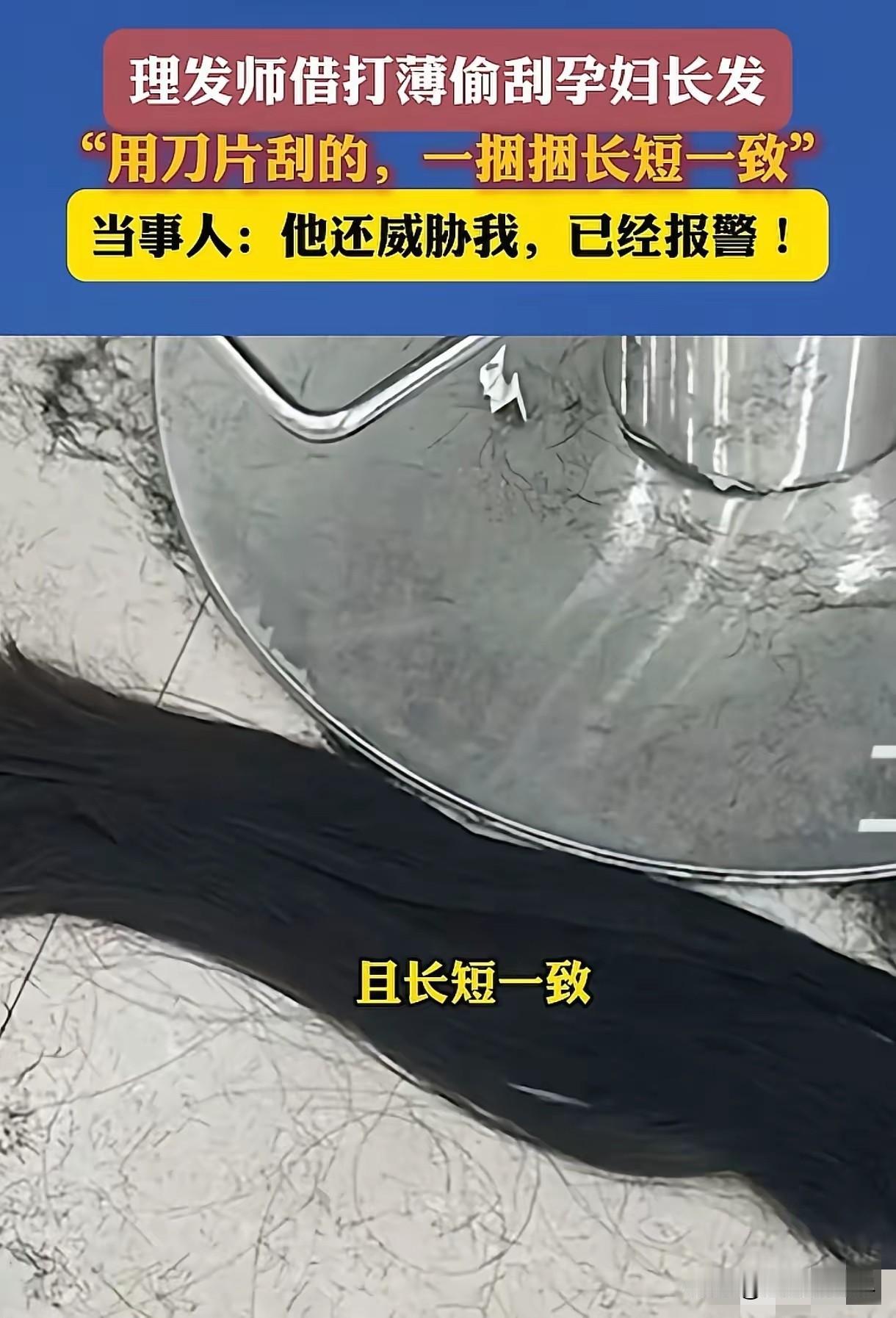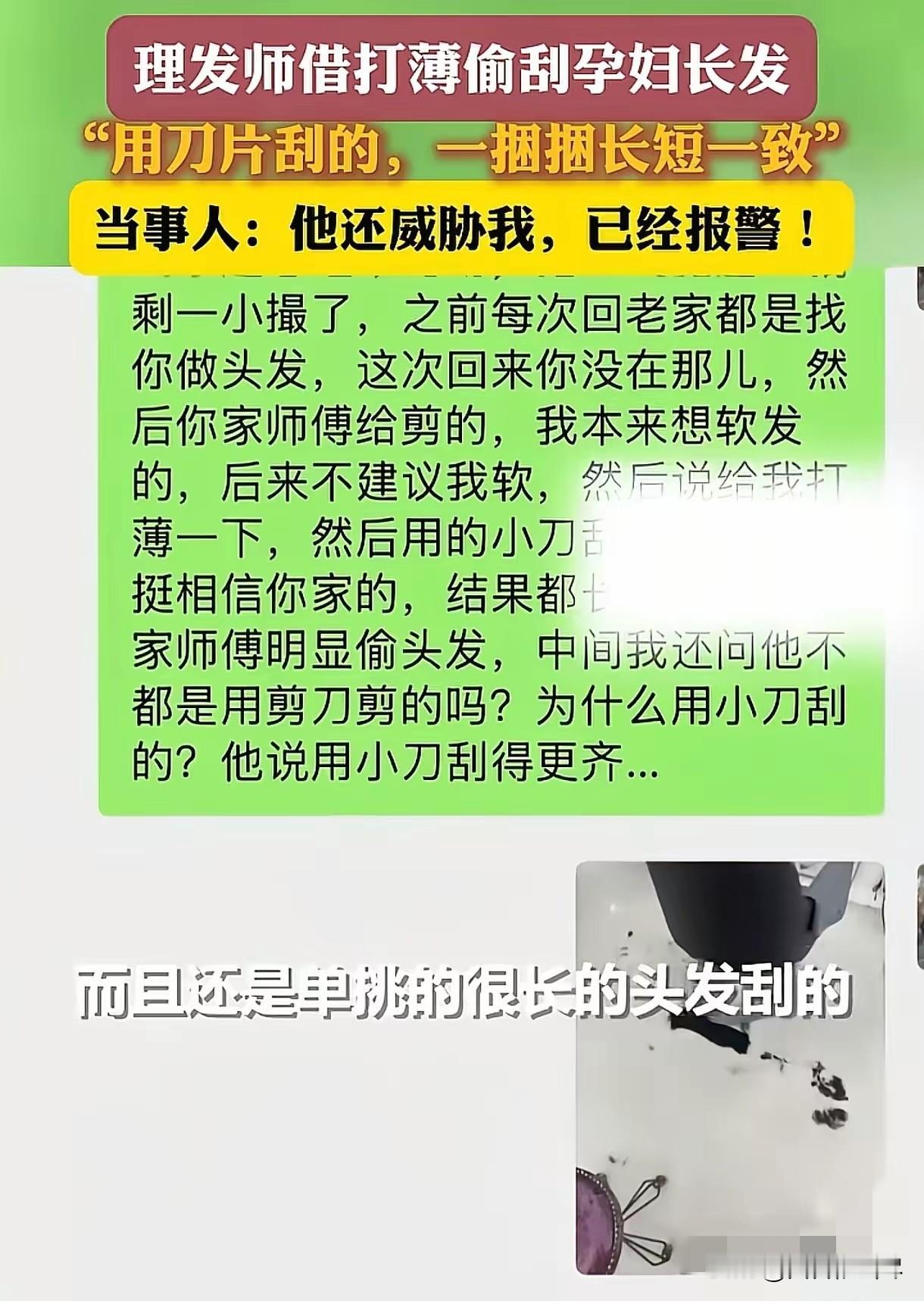 河南驻马店,女子去理发店护理头发,理发师却说女子怀孕了,孕期不能软发,建议女子打薄。女子听劝,可没想到,理发师竟然用刀片贴着头皮刮长发,并且刮下来的头发还是长短一致,一捆捆摆放整齐的。女子拍下照片询问熟人后,确认对方就是恶意偷刮长发拿去卖钱,找到店家,可店家的态度却让人难以接受。 2026年2月,河南驻马店一位身处孕期的女子,为了打理日常发型,特意选择家附近的一家理发店,计划做一次常规的头发软化护理,让干枯毛躁的发丝变得柔顺服帖。 女子提前梳理好自身需求,进店后清晰告知理发师,只需要针对头发中段进行软化处理,不改变整体长度,也不做大幅度修剪,全程只追求发丝质感的改善。 理发师在简单触摸发丝、观察长度与发质状态后,并没有直接开始操作,反而主动向女子提及孕期相关注意事项, 声称软化产品中包含多种化学制剂,气味与成分都不适合孕期女性接触,长期接触可能产生不必要的影响,言语间处处表现出为女子身体健康着想的态度。 在持续的劝说下,理发师明确建议女子取消软化项目,更换为简单的头发打薄处理,称打薄只需要修剪少量碎发, 不会接触任何化学用品,对身体完全无害,同时还能让头发看起来更轻盈蓬松,适配孕期不便频繁打理的状态。 女子本身对美发行业的专业知识了解不多,加上自身处于特殊孕期,格外在意身体与胎儿安全, 面对理发师看似贴心且专业的提醒,没有产生过多怀疑,完全放下戒备,当场同意更改服务项目,按照打薄的要求配合理发师完成后续操作。 正常的头发打薄工序,会使用专用打薄剪刀,从头发中部位置逐步修剪,只去除少量内层发丝,保留外层完整长度与发型轮廓,全程不会触碰头皮,更不会出现大面积剪短的情况。 但这位理发师从始至终没有使用常规剪发工具,而是悄悄拿出锋利的单面刀片,在女子看不到的后脑勺、头顶等位置,紧贴着头皮位置快速刮剪,动作迅速且刻意避开女子的视线范围。 女子坐在理发椅上,只能隐约感觉到头皮传来冰凉坚硬的触感,与平时剪发的剪刀触感截然不同, 偶尔还能感受到发丝被快速拉扯、切断的细微动静,心中逐渐升起异样的疑惑,想要转头查看时,都会被理发师以保持姿势、避免修剪不齐为由制止。 整个修剪过程持续的时间远超普通打薄,理发师全程专注于刮取发丝,时不时低头整理地面掉落的头发, 将长短一致、完整顺滑的长发一根根收拢,仔细捆扎成整齐的小捆,整齐摆放在地面角落,丝毫没有处理碎发的随意感。 女子全程无法直观看到自身头发的变化,只能被动等待结束,直到理发师示意修剪完成, 她起身看向镜子,才发现原本及腰的长发明显变短,发根位置发丝稀疏凌乱,整体发量减少了一大半,与原本只打薄碎发的预期效果相差甚远。 察觉到不对劲的女子,第一时间拿出手机,拍摄下地面成捆整齐的长发、自己被修剪后的头发状态,以及理发师摆放发丝的现场画面, 随后匆匆离开理发店,第一时间联系长期接触美发行业的熟人,将拍摄的照片与全程经历详细告知对方。 熟人在仔细查看照片、核对修剪手法与发丝状态后,明确告知女子,紧贴头皮用刀片刮取完整长发、捆扎整齐的操作,绝非正常打薄流程, 而是行业内专门盗取顾客长发用于售卖的隐蔽手段,这样刮下的发丝完整度高、长度统一,在回收市场能卖出更高价格,理发师全程都是利用孕期女性的信任,刻意隐瞒真实目的,私自盗取顾客养护多年的长发。 得知全部真相后,女子立刻折返理发店,想要与店家沟通此事,要求对方给出合理的解释,并对私自刮剪长发、盗取发丝牟利的行为作出回应。 面对女子出示的全部照片证据、清晰描述的操作过程,店内相关人员没有表现出任何歉意,也没有主动协商解决问题的意愿,既不承认使用刀片违规刮发的行为,也不回应地面成捆长发的来源与用途, 对女子提出的所有疑问都采取回避态度,整体态度强硬且敷衍,始终拒绝正面沟通,也不愿承担相应的责任。 女子回忆,自己的长发已经精心养护多年,发丝粗壮顺滑、长度可观,一直舍不得大幅度修剪,此次原本只是简单护理,却在不知情的情况下被恶意刮剪,不仅头发受损严重,还被当作牟利的工具,内心充满委屈与气愤。 她完整保留了现场拍摄的照片、进店消费记录以及与熟人的沟通记录,准备通过正规途径维护自身合法权益。 而理发店门口原本就张贴着高价回收长头发的相关提示,也与此次理发师偷刮长发的行为形成对应,让整个事件的脉络更加清晰。 一场普通的消费服务,因为店家的不当操作,变成了令人糟心的维权经历,也让更多消费者开始留意美发过程中容易被忽视的隐蔽问题。 对此,你们有什么看法,欢迎评论留言~