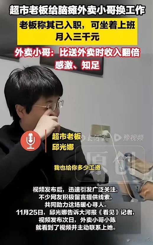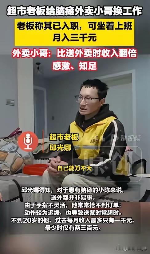 2025年,江苏宿迁超市一老板,由于一时疏忽让一外卖员在店内白白等了很久,她感到十分愧疚,果断发布寻人启事,寻找这位残疾外卖小哥,哪料见面后才发现,这位19岁小伙因脑瘫求职屡屡碰壁,月收入曾低至两三百元,没想到邱光娜的一个决定,不仅让他重获工作,还意外点燃了更多希望。 2025年11月,江苏宿迁一家超市里,一场因工作疏忽引发的小意外,悄悄改写了一位年轻外卖员的生活轨迹。 超市经营者邱光娜在日常直播运营时,为保证直播流程顺畅,将工作手机调至飞行模式,全程专注于线上内容与店内货品整理,结束后才想起查看外卖取餐相关记录,调取监控后,一段画面让她满心愧疚。 监控里,一名身形单薄的年轻外卖员在店内缓慢移动,肢体动作略显僵硬,反复在取餐区域与货架之间徘徊,始终无法联系到接单负责人, 只能默默等候,全程没有惊扰其他顾客,也没有随意走动,安静地站在角落等待取餐通知,漫长的等待时间里,年轻人的身影显得格外无助。 意识到自己的疏忽给对方带来不便后,邱光娜没有选择忽略此事,而是立刻整理监控画面与相关信息,通过社交平台发布寻人内容,清晰说明当日情况与自身失误,希望能找到这位外卖员,当面表达歉意并弥补对方的时间损失。 寻人信息发布后很快引发关注,短短一天时间,这位名叫小陈的19岁外卖员看到内容后主动取得联系,双方顺利见面。 沟通中邱光娜了解到,小陈患有先天性脑瘫,肢体协调能力与行动速度都不及常人,中专毕业后多次外出求职,接连被各类岗位拒绝, 餐饮、仓储、配送等常见工作都因身体条件无法适配,始终没能找到稳定的谋生出路。 为了维持基本生活,小陈只能选择外卖配送工作,依靠零散订单赚取收入,可肢体不便让他抢单效率极低,送餐途中频繁出现延误,订单量长期偏少,收入极不稳定,收入最低的月份,到手仅有两三百元,连日常开销都难以支撑。 即便生活窘迫,小陈依旧坚持自食其力,不愿依靠家人接济,每天顶着压力奔波在送餐路上,努力撑起自己的生活。 了解到这些经历后,邱光娜没有停留在简单的道歉与安慰,而是结合超市实际运营需求,做出了一个改变小陈生活的决定。 她为小陈量身安排了适合久坐、操作简单的岗位,主要负责超市入口小票核验、秩序引导等轻松工作, 全程无需长时间行走或负重,工作强度与节奏都贴合小陈的身体状况,同时确定稳定薪资,每月收入可达三千元,彻底告别此前不稳定的低收入状态。 入职后,超市团队主动给予包容与照顾,简化工作流程,预留舒适的工作位置,让小陈能够轻松适应新环境,不用再风里雨里奔波送餐,也不用再为每月微薄的收入发愁。 这份稳定的工作,不仅解决了小陈的生计难题,更让他在踏实的劳动中找回生活底气,慢慢摆脱求职碰壁带来的挫败感。 随着小陈顺利融入工作,周边不少商户与求职者也关注到这件事,越来越多的人开始关注残障群体就业问题,不少本地经营者主动询问适配岗位的设置方式,愿意为残障求职者提供力所能及的工作机会, 原本只是一次个人善意的选择,慢慢带动起身边的温暖氛围,让更多身处困境的求职者看到新的希望。 平凡的日常里,一次及时的弥补,一份真诚的接纳,让原本艰难的生活迎来转机,也让普通人之间的善意,慢慢汇聚成照亮他人的光。 对此,你们有什么看法,欢迎评论留言~