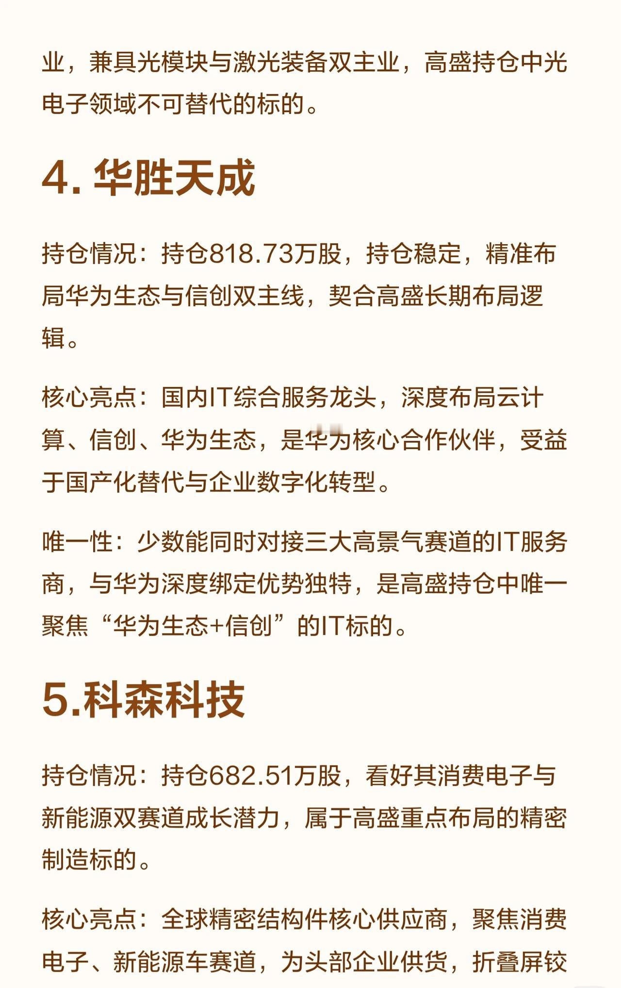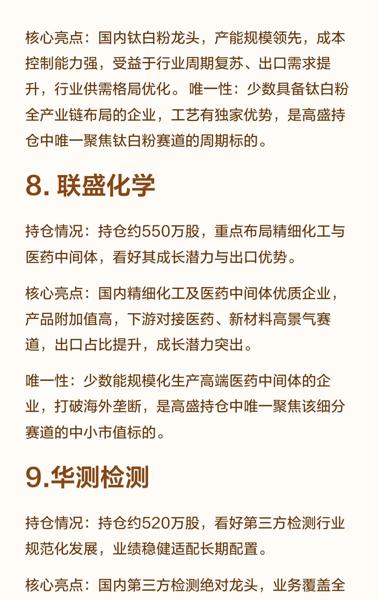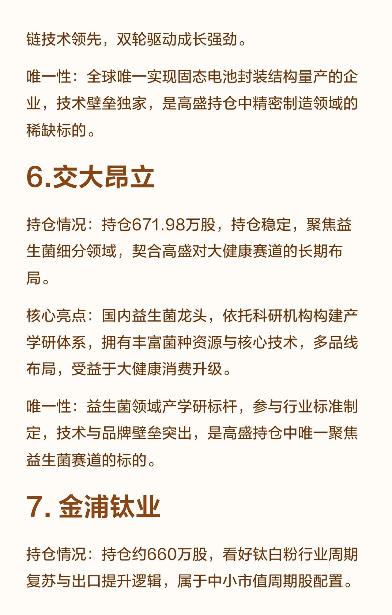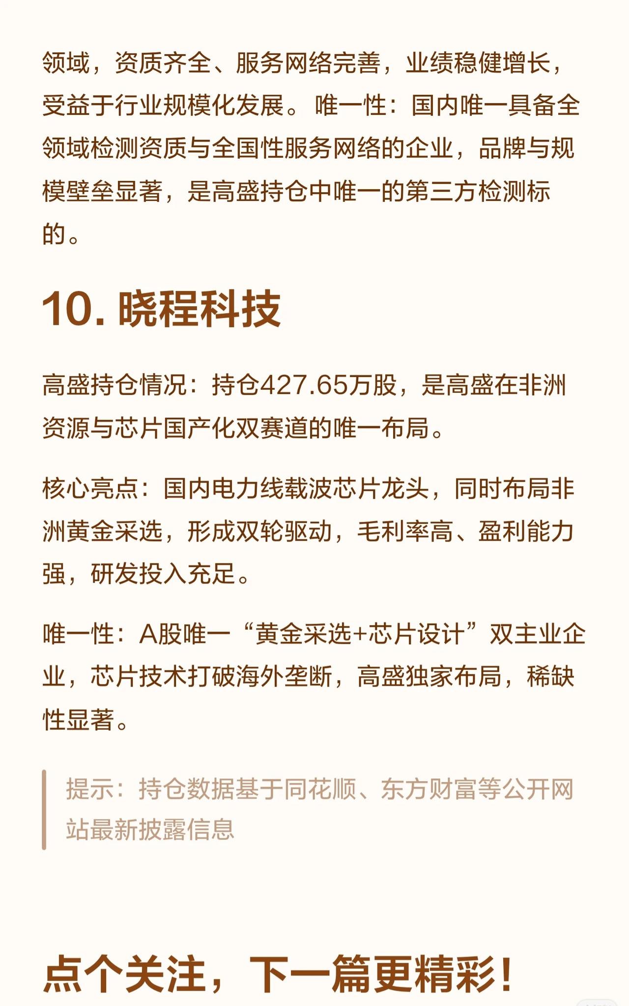 高盛持有10家具“唯一性”的A股公司,核心如下: 1. 兴业银锡:银锡资源龙头,独家开采提纯技术,新能源上游核心。 2. 豪威集团:全球CIS龙头,唯一“车载+AI”双场景标的。 3. 华工科技:光电子龙头,唯一全系列高速光模块量产。 4. 华胜天成:IT综合服务龙头,唯一“华为生态+信创”标的。 5. 科森科技:全球精密结构件核心,消费电子+新能源双赛道。 6. 交大昂立:益生菌龙头,唯一聚焦益生菌赛道。 7. 金浦钛业:钛白粉龙头,唯一聚焦该赛道的周期标的。 8. 联盛化学:精细化工/医药中间体,唯一规模化高端医药中间体企业。 9. 华测检测:第三方检测绝对龙头,唯一全领域资质+全国网络。 10. 晓程科技:A股唯一“黄金采选+芯片设计”双主业,非洲资源+芯片国产化布局。 这些公司均因技术壁垒、赛道稀缺性或龙头地位,成为高盛长期持仓的核心选择。