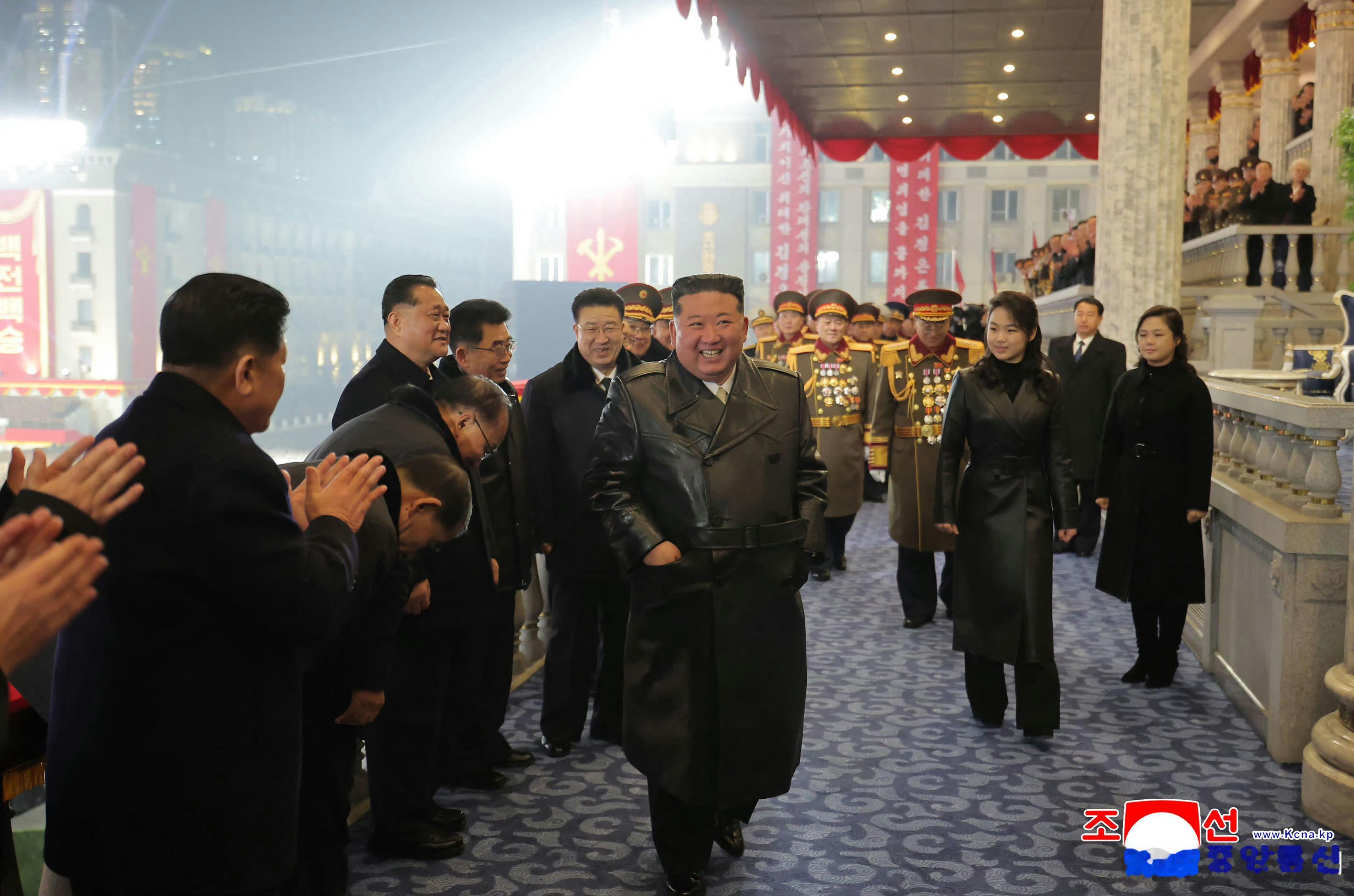 朝鲜庆祝九大的夜间阅兵,一家三口出席。