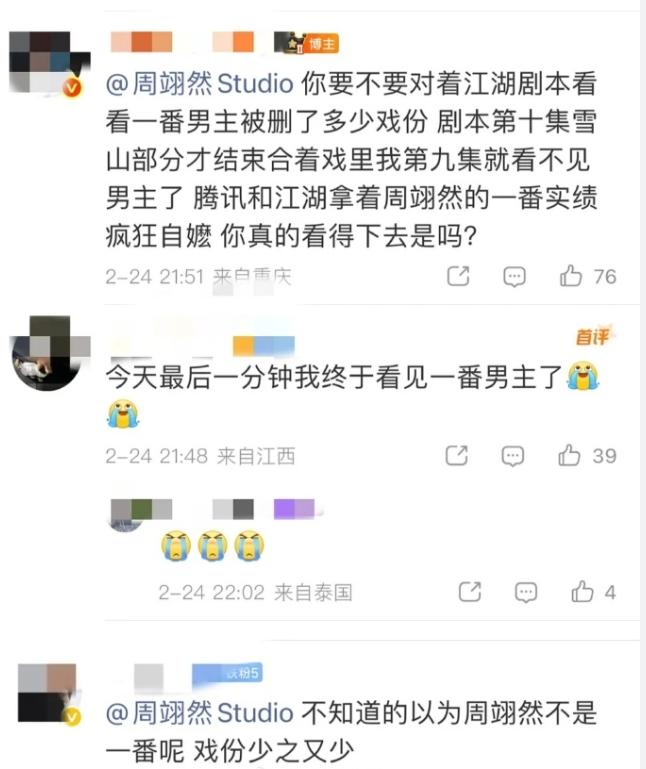 周翊然粉丝也开始维权了! 周翊然是《江湖夜雨十年灯》的一番男主,不过从目前播出的剧情来看,他的戏份确实有点少,已播的剧情都是以女主的视角展开的,这部小说的作者是关心则乱,也就是《知否》和《星汉灿烂》的作者,非常擅长写女频本子,《江湖夜雨十年灯》原本就是女频本子,女纸比男主戏份多,虽然一番是周翊然,但是包上恩的戏份应该更多。