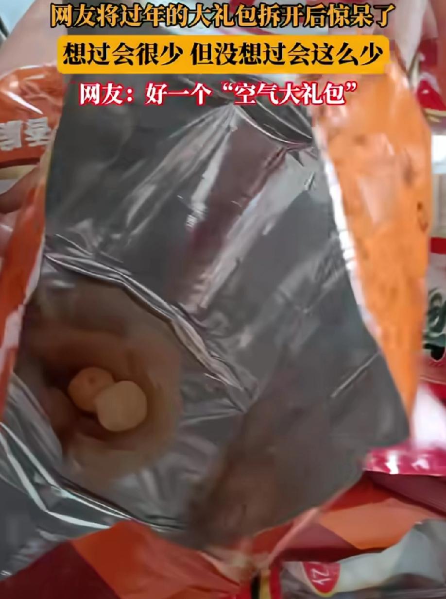 见过厉害的,没见过这么狠的! 一网友将过年的大礼包拆开后惊呆了,想过会很少,但是真看到一袋里面只有2个的时候,直接破防了。 这哪是什么大礼包,简直就是“视觉欺诈”。袋子外观看着老大了,包装还挺精美,可一打开,就跟变戏法似的,就那么可怜巴巴的俩。 这狠的太过分了,生产的时候被员工偷吃再封口的?这公摊面积也太大了! 所以过年这些大礼包就不用买了,就买米买油,实际点靠谱点!