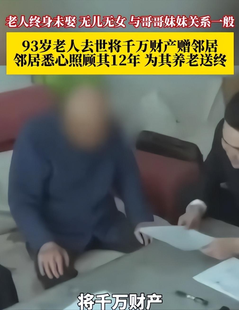 12年照料换千万遗产!老人去世把5套房全给邻居,亲兄妹闹上法庭,法官一句话怼得哑口无言 这位大爷姓阮2011年的时候,已经81岁高龄了,那时候的他守着家里11间破旧的老房子,一个人孤零零地生活,身边没有任何亲人照料,他的眼睛几乎看不见,腿脚也不利索,连走路都成问题,生活完全不能自理,有时候连一口热乎饭都吃不上,日子过得捉襟见肘,凄凉得让人心疼。 可能有人会问,他不是有四个哥哥和一个妹妹吗?怎么会没人管?说起来也让人寒心,阮大爷和这些亲戚,平日里几乎没有任何来往,就跟陌生人一样,那些哥哥妹妹,平日里各自过着自己的日子,从来没有主动来看望过他,更别说照顾他的饮食起居,仿佛这个弟弟(哥哥)根本不存在一样,对他的凄凉晚景,不管不问漠不关心。 就在阮大爷走投无路、无人照料的时候,他的邻居刘先生,看在眼里疼在心里,刘先生是个特别善良的人,实在不忍心看着一位八旬老人独自受苦,于是就主动站了出来,承担起了照顾阮大爷的义务,他没有图什么回报,只是出于一份恻隐之心,想着能给老人晚年一点温暖,让老人能安安稳稳地度过余生。 为了让这份照料有个凭证,也为了让阮大爷放心,在村委会的见证下,刘先生和阮大爷签订了一份遗赠扶养协议,协议里写得清清楚楚,阮大爷的余生由刘先生负责照料,从饮食起居到养老送终,刘先生都要尽心尽力,而阮大爷名下的11间房屋等全部财产,在他离世之后,全部赠与刘先生,作为对刘先生多年照料的回报。 签完协议之后刘先生就彻底把阮大爷当成了自己的亲人来对待,一言一行都践行着协议里的承诺,他每天准时上门,给老人做饭、喂饭、擦身、洗衣服,无微不至地照顾着老人的一切,遇到老人身体不舒服,不管是深夜还是凌晨,他都会第一时间送老人去医院,忙前忙后地照料,从不抱怨一句。 后来村子拆迁,阮大爷名下的11间老房子,一夜之间变成了5套回迁安置房,外加380多万的拆迁补偿款,算下来妥妥的千万身家,八旬老人一下子从穷老头,变成了千万富翁,这时候很多人都以为刘先生会变心思,可他没有依旧像以前一样,悉心照料着阮大爷,没有丝毫懈怠。 日子一天天过去,刘先生日复一日地照顾着阮大爷,从没有间断过,这一照顾就是整整12年,4000多个日日夜夜,他用自己的行动,践行着当初的承诺,把一个毫无血缘关系的老人,当成了自己的亲爹来伺候,这份情谊,比很多有血缘关系的亲戚还要深厚。 2023年93岁的阮大爷安详离世。刘先生没有辜负老人的信任,按照当初的约定,为老人披麻戴孝,以儿子的身份,守在灵堂前答礼,风风光光地送了老人最后一程,尽到了养老送终的全部义务,村里的人都看在眼里,无不称赞刘先生的善良和守信,都说就算是亲儿子,也未必能做到这份上。 可谁能想到,阮大爷的葬礼刚刚结束,纸灰还没烧尽,那些平日里跟人间蒸发了一样的亲戚,就突然从四面八方冒了出来,他们此行的目的,根本不是奔丧,而是冲着阮大爷留下的千万遗产来的,看着那5套回迁房和380多万现金,这些亲戚们红了眼,纷纷要求继承这笔遗产,还振振有词说自己是老人的近亲属,有血缘关系,理所当然应该继承老人的财产。 面对这些突然冒出来的亲戚,刘先生没有慌乱,平静地拿出了当年和阮大爷签订的遗赠扶养协议,看着眼前这些贪婪的面孔,积压在心里12年的委屈和愤怒一下子爆发出来,怒怼他们质问他们在老人卧病在床、生活不能自理、最需要人照顾的时候,都躲到哪里去了,从来没有来看过一眼,现在老人走了,却跳出来争遗产,凭什么? 刘先生的质问,像一记响亮的耳光,打在了那些亲戚的脸上,让他们瞬间语塞,一时之间没人能说出一句话来,他们心里清楚,自己从来没有尽过一点亲属的义务,没有照顾过老人一天,根本没资格来争这笔遗产,可贪婪驱使着他们不愿意轻易放弃。 最后这些亲戚不死心,竟然把刘先生告上了法庭,执意要争夺阮大爷的千万遗产,法院受理案件后,没有只看卷宗,而是亲自走进村子,挨家挨户走访,询问村里的干部和邻居,了解刘先生照顾阮大爷的真实情况。 所有人的证词都一模一样,大家都证明,刘先生照顾阮大爷12年,尽心尽责,比亲儿子还要周到,而那些所谓的近亲属,12年里从来没有露面,甚至不知道老人的基本情况,连老人平时忌口什么都不知道。 最终法院判决遗赠扶养协议合法有效,千万遗产全部归刘先生所有,驳回了那些亲属的全部诉求,给了刘先生一个公平公正的结果,也狠狠打了那些贪婪亲戚的脸。