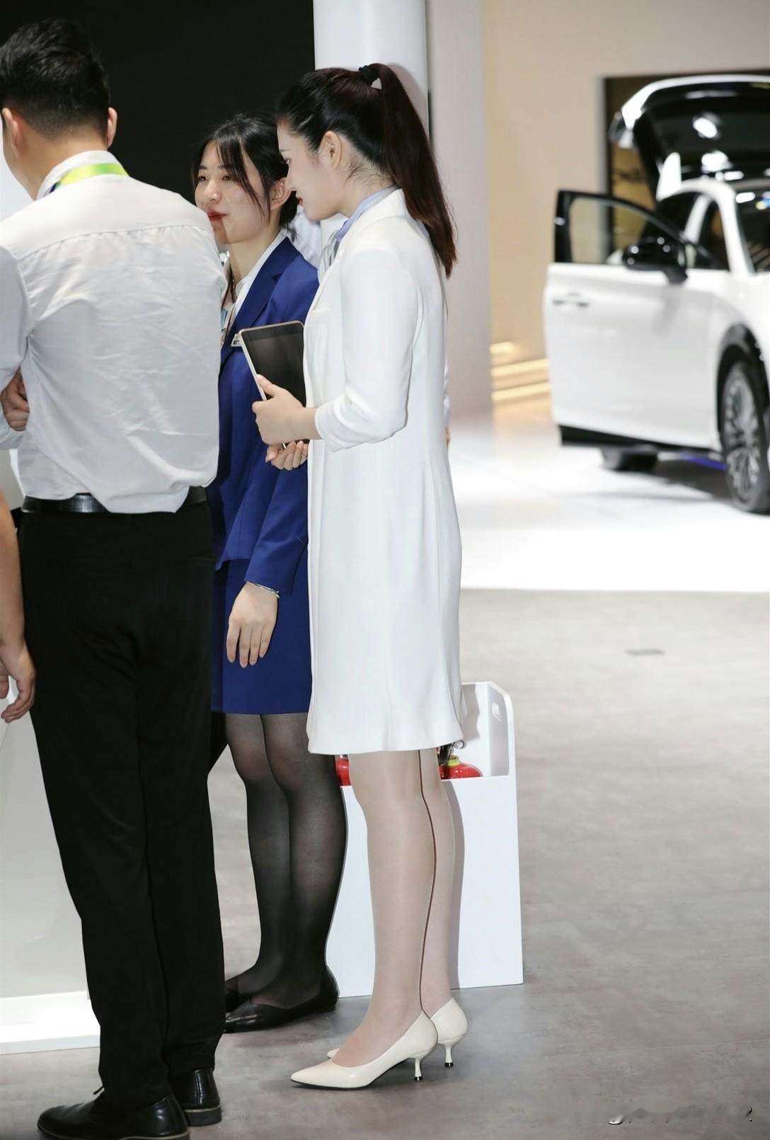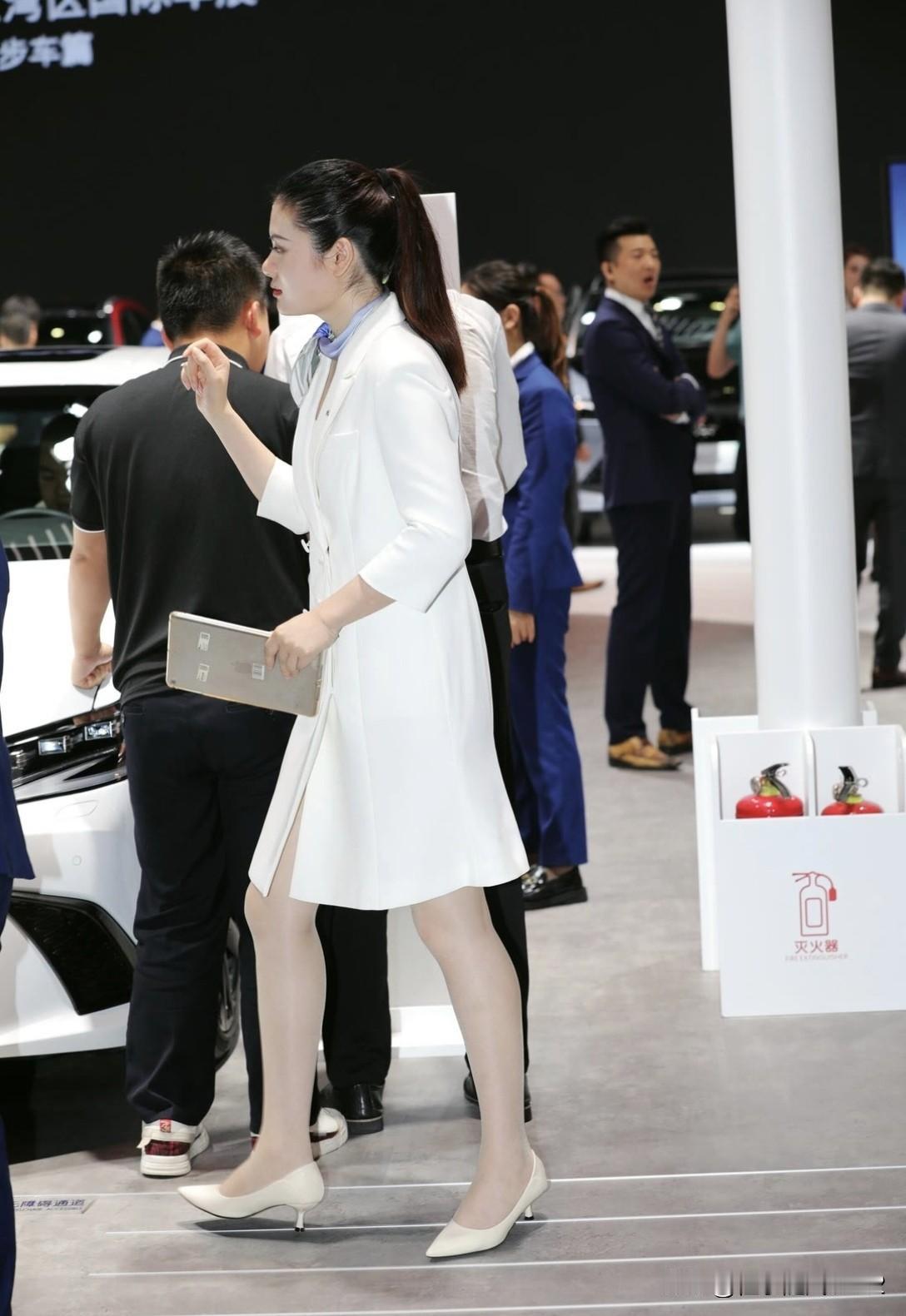 优雅车模在车展惊艳亮相,白色西装搭配紫色丝巾,尽显时尚与专业