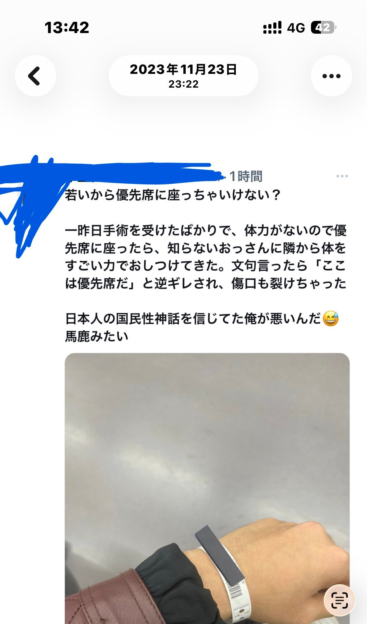 日本华人推友讲述之前遭遇“撞人党”:手术出院坐电车回家,因坐到“优先座”而被日本大叔用力挤到墙上,事后发现手术伤口裂开,衣服里面全是血,被迫当天返回医院治疗。
