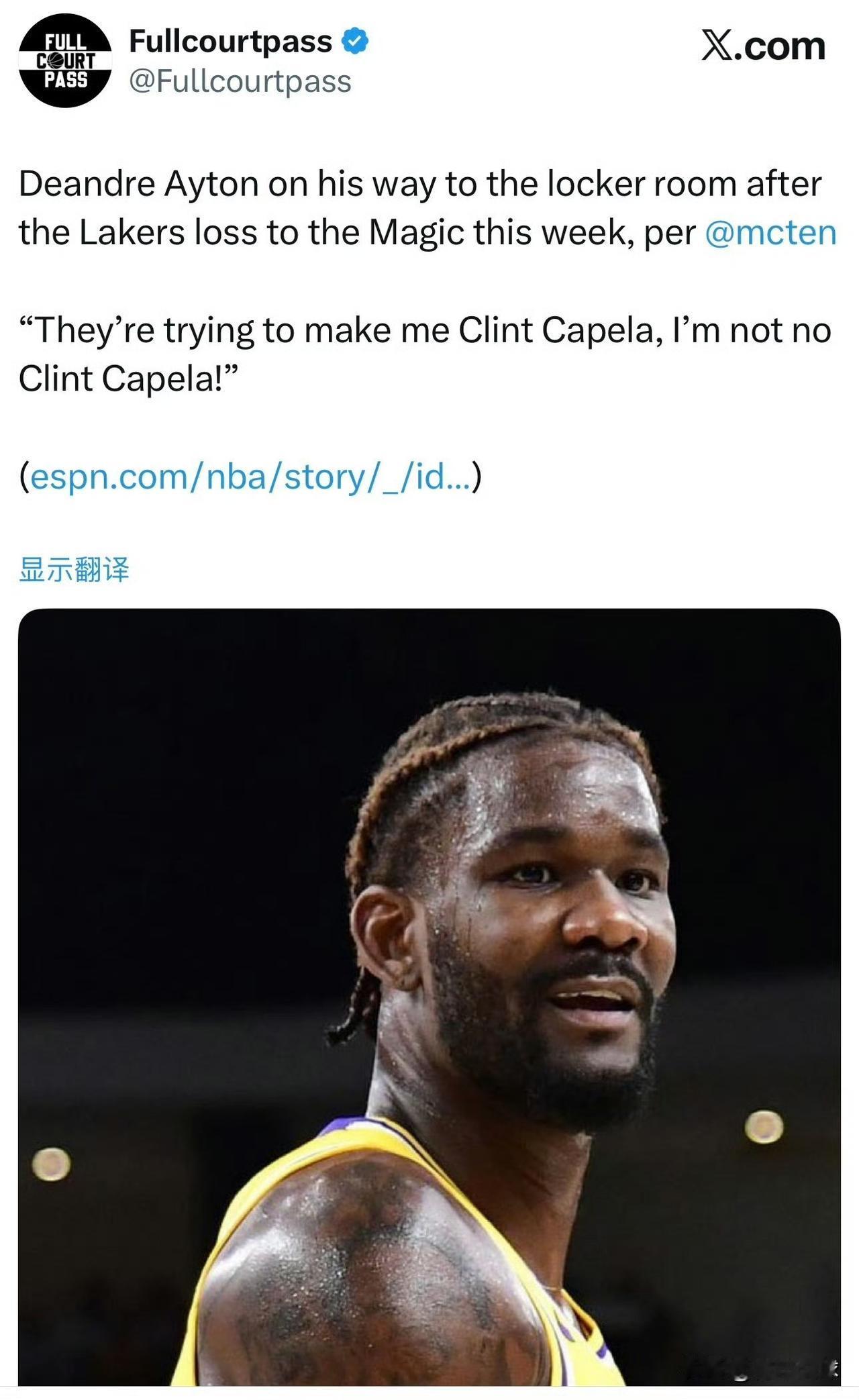 艾顿不满!湖人队内讧了! 据湖人队跟队记者Dave McMenamin报道:在昨天不敌魔术队后,艾顿在接受完公开采访返回更衣室途中大喊“他们想把我当成卡佩拉使用,但我根本不是卡佩拉这类球员”,声音大到更衣室里所有球员都能听到。 很明显,这是艾顿在公开抱怨自己过低的战术地位,他是一名进攻天赋出色的内线球员,而不仅仅是一个只会“吃饼”、掩护、抢篮板的高级蓝领,让他只干脏活累活而不参与进攻太不公平了。艾顿如果能在内线连续完成得分,对于三巨头来说也能减轻不少压力。艾顿的不满不无道理,湖人队需要让艾顿更多的参与进攻,尤其是更多的和三巨头进行配合,这是雷迪克急需处理掉问题!