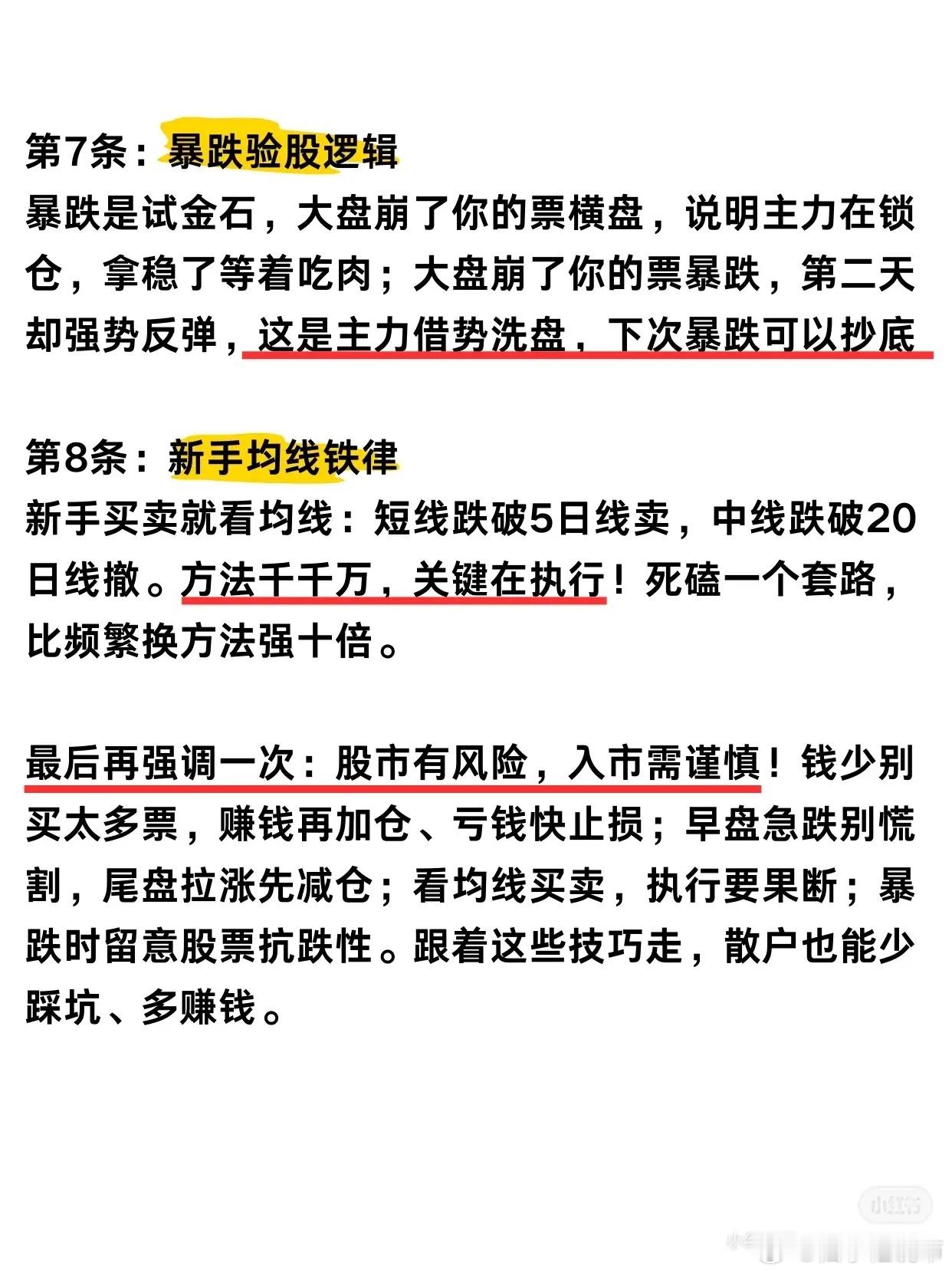 - 股市有风险,入市需谨慎。- 钱少别买太多票,赚钱再加仓、亏钱快止损。- 早盘急跌别慌割,尾盘拉涨先减仓。- 看均线买卖,执行要果断。- 暴跌时留意股票抗跌性。