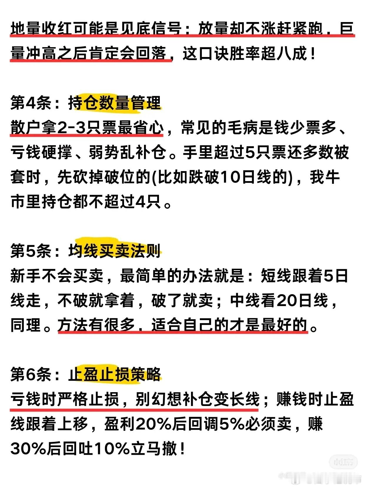 - 亏钱时严格止损,不幻想补仓变长线。- 赚钱时止盈线随盈利上移: - 盈利20% → 回调5%必须卖 - 盈利30% → 回吐10%立刻撤