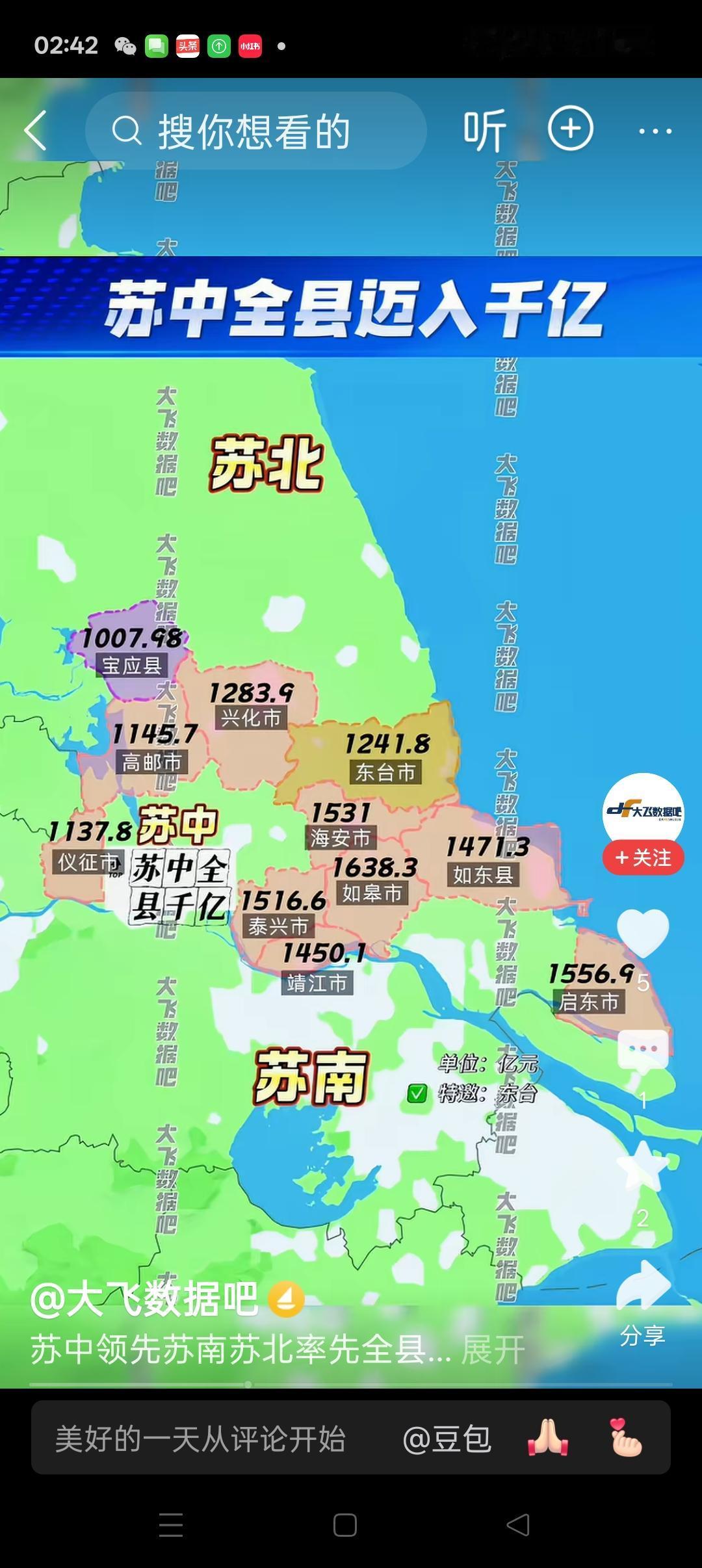 苏北、苏中、苏南的“三级跳” 不管江苏的区域如何划分,从经济发展及人民生活水平来讲,江苏确实存在苏南、苏中、苏北三地区的明显差异,无论是人均GDP,还是人均可支配收入,都显现出苏北、苏中、苏北“”三级跳”的状态: 人均GDP方面,苏南5市都在17.8万元以上;苏中3市均在16.2万元至17.6万元之间;而苏北5市则均在10.1万元至12.4万元之间。 人均可支配收入方面,苏南5市都在全省平均水平57971元以上;苏中3市虽未达到全省平均线,但都在50000元以上;而苏北5市则全部在50000以下。 苏北与苏南的差距较大,我们暂且不作比较,就再看一看苏北与苏中GDP方面的差距吧,这里发现一个很有趣的现象,苏中3市GDP全县都迈入千亿,人均水平自然就高;而苏北5市没有一个城市做得到。以GDP总量第二、人均GDP第二、人均可支配收入第一的盐城为例,全市11个县区中,只有东台GDP过千亿,其它县区均在千亿以内,最高的800多亿,最低的300多亿。可以想象,如果盐城也象苏中3市那样,全县区GDP都过千亿的话,人均GDP及人均可支配收入势必赶上甚至超过苏中3市的水平。高起点下的均衡发展比不上苏中,更落后于苏南。这大概就是苏北、苏中、苏南“三级跳”的原因所在。