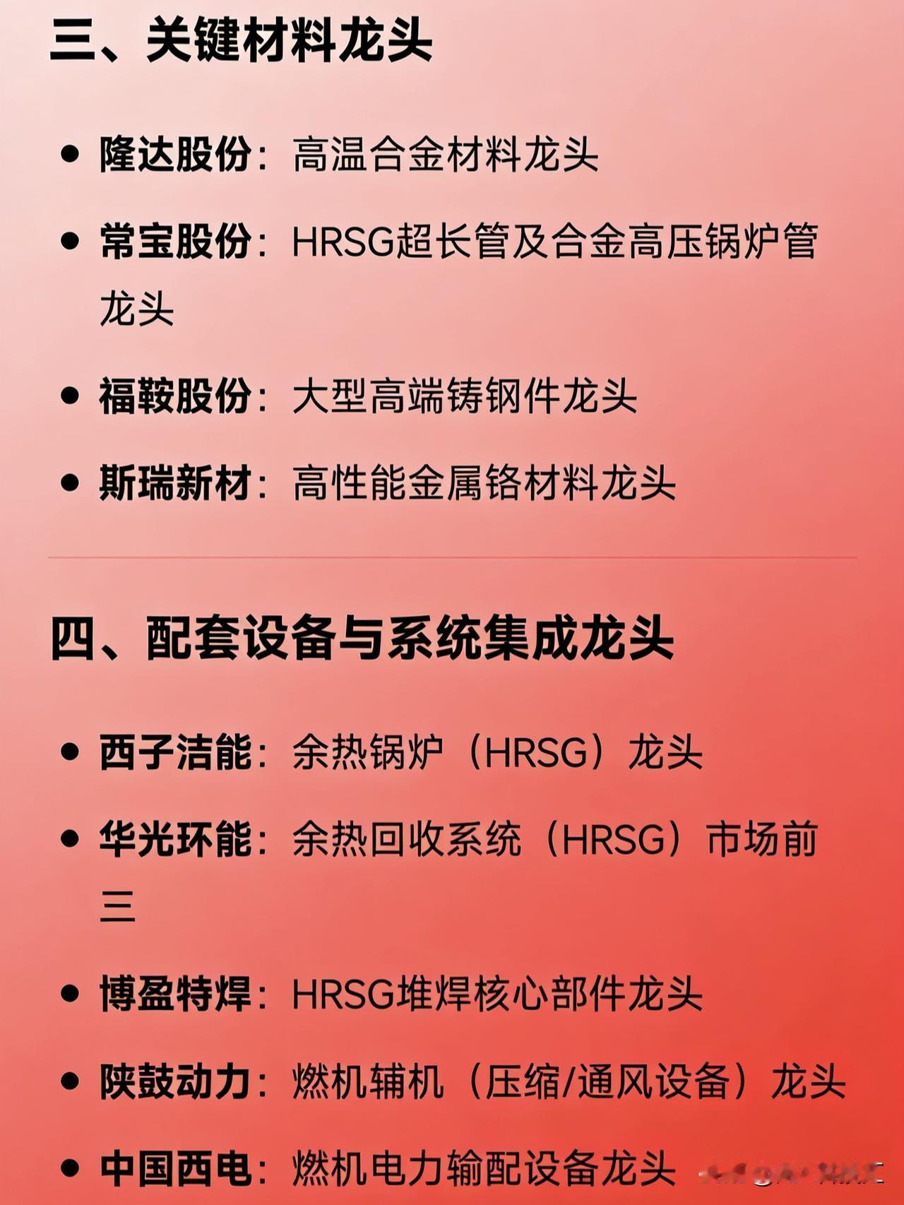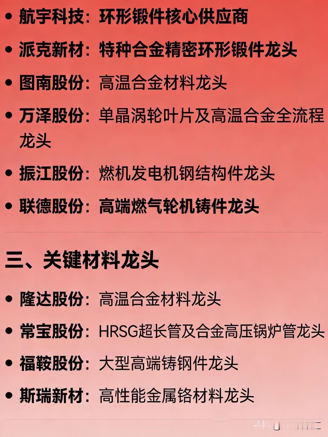 燃气轮机概念相关龙头企业汇总 一、整机制造龙头 东方电气:国内重型燃气轮机整机龙头 上海电气:F/H级重型燃机全链条供应商 杰瑞股份:北美AI数据中心燃气轮机发电机组龙头 航发动力:航改型燃气轮机整机平台龙头 二、核心零部件龙头 应流股份:高温合金涡轮叶片龙头 豪迈科技:燃气轮机缸体/环类零件精密铸造全球龙头 航宇科技:环形锻件核心供应商 派克新材:特种合金精密环形锻件龙头 图南股份:高温合金材料龙头 万泽股份:单晶涡轮叶片及高温合金全流程龙头 振江股份:燃机发电机钢结构件龙头 联德股份:高端燃气轮机铸件龙头 三、关键材料龙头 隆达股份:高温合金材料龙头 常宝股份:HRSG超长管及合金高压锅炉管龙头 福鞍股份:大型高端铸钢件龙头 斯瑞新材:高性能金属铬材料龙头 四、配套设备与系统集成龙头 西子洁能:余热锅炉(HRSG)龙头 华光环能:余热回收系统(HRSG)市场前三 博盈特焊:HRSG堆焊核心部件龙头 陕鼓动力:燃机辅机(压缩/通风设备)龙头 中国西电:燃机电力输配设备龙头