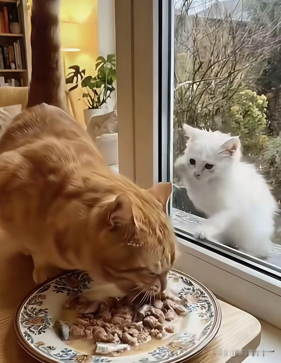 谁能拒绝一只心软到骨子里的小猫咪啊! 网友家养了一只胖橘,平日里被宠成了小少爷,顿顿有美味,吃嘛嘛香。这天橘猫正趴在地上,埋头干饭吃得津津有味,小脑袋埋在碗里,完全沉浸在干饭的快乐里。 它不知道的是,玻璃门外,一只浑身雪白的流浪猫,正安安静静地站在那里,扒着门缝眼巴巴往里看。 那双眼睛里,全是藏不住的羡慕,看着里面衣食无忧的小橘猫,看着它碗里吃不完的粮食,小小的身影缩在门外,又乖又让人心疼。 就在这时,主人刚好回家,一眼就看到了这戳心的一幕:里面是被爱包围、无忧无虑的干饭猫,外面是无家可归、满眼渴望的小流浪。 主人没有丝毫犹豫,立刻打开门,轻轻把这只怯生生的小白猫抱进了屋里。 本以为家里的橘猫会护食、会生气、会排斥外来的小猫,结果接下来的画面,直接暖哭所有人! 小橘猫非但没有敌意,反而主动凑上去和小白猫贴贴,脑袋蹭着脑袋,亲昵得像认识了很久的小伙伴。 更让人破防的是,它还主动把自己的饭碗推到小白猫面前,邀请它一起吃;甚至伸出软软的小爪子,轻轻抚摸小白猫的头,温柔得不像话。 没有争抢,没有排斥,只有满满的接纳和温柔。 原来小猫咪也懂心疼同类,原来被爱包围的小猫,连骨子里都透着善良。 主人当场就决定:收养这只小白猫! 从此,小流浪有了家,有了爱它的主人,还有了一个愿意分它食物、温柔待它的橘猫哥哥。 一个心软的主人,一只善良的小猫,给了另一只小流浪一生的温暖。 愿世间所有毛孩子,都能被温柔以待,再也不用在寒风中羡慕别人的幸福❤️