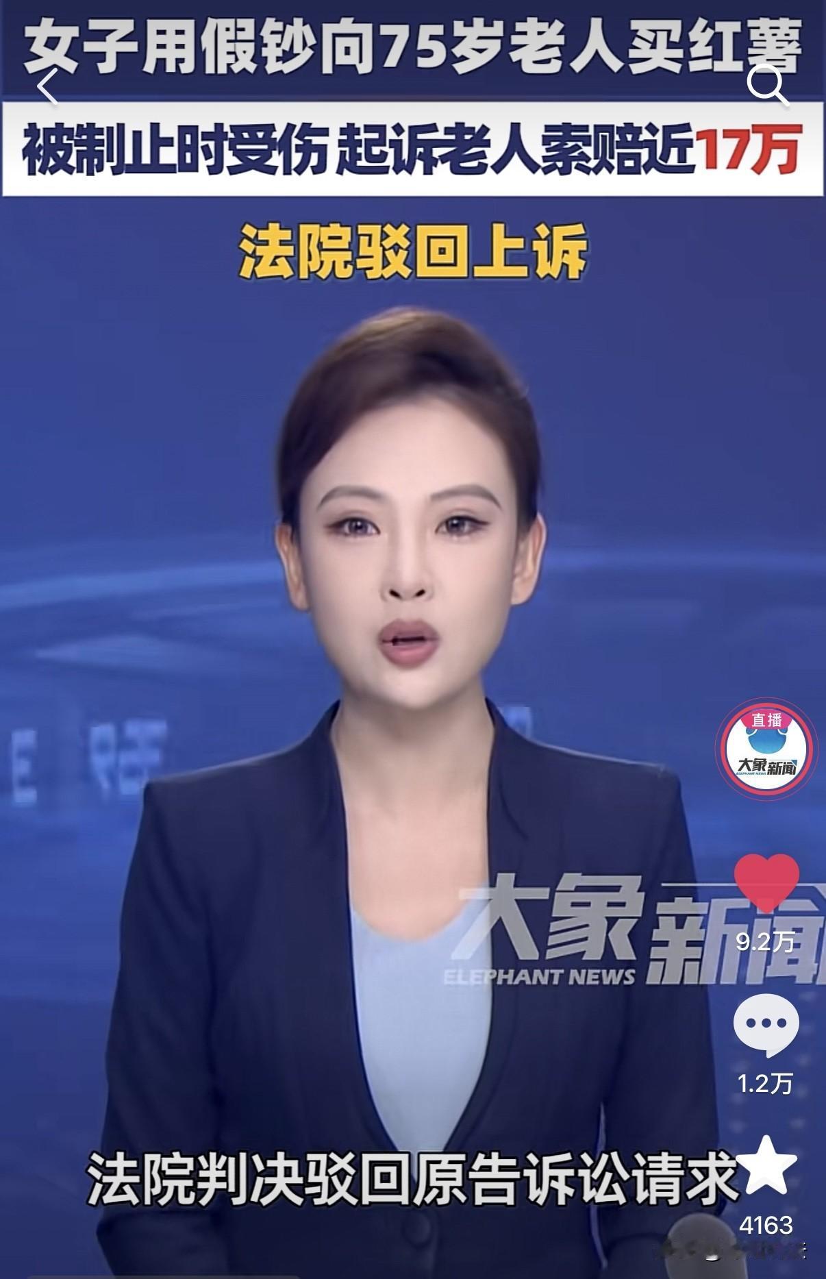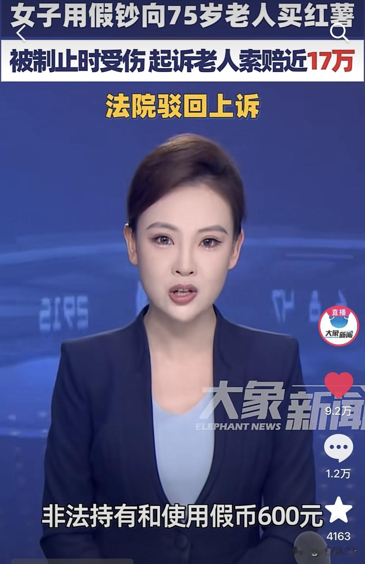 江苏南京,女子去菜市场买菜,看到路边蹲着一个75岁的老人在卖红薯,女子想起前几天收到600块钱假钞,就想趁机用假钞买老人的红薯,顺便找点零钱回回本。谁知道老人发现了,还叫来了女儿帮忙辨认,女儿和女子扭打在一起,女子脸上受了点轻伤,民警来了后,将女子拘留了7天。谁知道,女子竟然不服气,起诉老人和女儿,要求她们赔偿16.8万余元。 一天下午,王女士到农贸市场买菜,她左挑挑右看看,差不多买够了自己需要的菜之后,就打算打道回府,准备给家里人做饭。 就在这时,王女士看到路过有一个卖红薯的老人,王女士想着,之前老公孩子说想要吃红薯,要不多买一点回家放着。 她停在老人旁边,问老太太这红薯怎么卖,新不新鲜啊。 老人看到自己的小摊来人光顾,很高兴很热情地解答了王女士的问题,王女士一看,老人岁数这么大了,眼看不大清,说话听声也都不太利索,心里就开始打起了小算盘。 原来,王女士想起前些天无意中收到了几张假钞,正愁花不出去呢,砸在自己手里自己也心疼,今天本来就是想来农贸市场,趁机花出去的,一直没找到机会,正巧机会自己送上门了。 于是,王女士试探性地问了几个问题,然后就在老人那里买了一大堆红薯,将600元假钞给了老人。 王女士心里还美滋滋呢,觉得自己白得了一堆红薯,还能找点零钱回回血,真是占了大便宜。 可是这个老人虽然岁数大,实际上一点也不糊涂,她接过这600元后仔细瞧了又瞧,不瞧不要紧,一瞧还真让她看出不对来了。 老人问王女士,你这给我的是假的吧。王女士一听,哎,这老人还挺聪明,居然让她发现了。 但这个时候王女士也不可能承认自己给的是假钱,还和老人辩驳了起来。两个人争执不下,无奈之中,老人只得叫来了女儿,让女儿帮自己看看。 女儿来了之后,她仔细一看这不就是假的吗,女儿也很生气,老人都这么大岁数了,还出来摆摊,而王女士居然连老人的钱都骗,当即就要将王女士扭送交给民警。 王女士一看情形不对,肯定不会乖乖跟着去,于是两个人就扭打在一起。 控制过程中,老人的女儿用力过猛,导致王女士的脸受了点伤,等到民警到达现场之后,这场闹剧才算结束。 后来,民警查实王女士非法持有及使用假钞600元。 王女士不仅没有将这600块假钞花出去,反而还要得到行政拘留7日的处罚,自己还受了伤,那自然是不甘心。 王女士觉得伤不能白受,她不好过,大家都别想好过,于是就以健康权受到侵害为由,起诉老人和她的女儿赔偿自己的损失168253.06元。 高达17万元的赔偿让老人难以承受,明明自己没做错,为什么要承受这么多的赔偿?老人不服,坚决不赔。 经审理认为,根据《人民银行法》第四十三条规定,购买伪造、变造的人民币,或者明知是伪造的人民币而持有、使用尚不构成犯罪的,由公安机关处以十五日以下拘留一万元以下罚款。 《民法典》第八条也规定,民事主体从事民事活动不得违反法律,不得违背公序良俗。 王女士在明知自己手中是假币的情况下,仍然使用,钻小空子,损害老人的利益来满足自己的需求,理应受到处罚。 受到处罚之后,王女士仍然不知悔改,反而倒打一耙。 最终,法院判定老人和女儿的属于自助行为,驳回了王女士的无理要求。 对此,您有什么看法?欢迎留言交流。 来源:大象新闻
