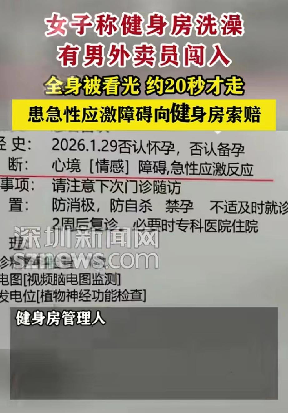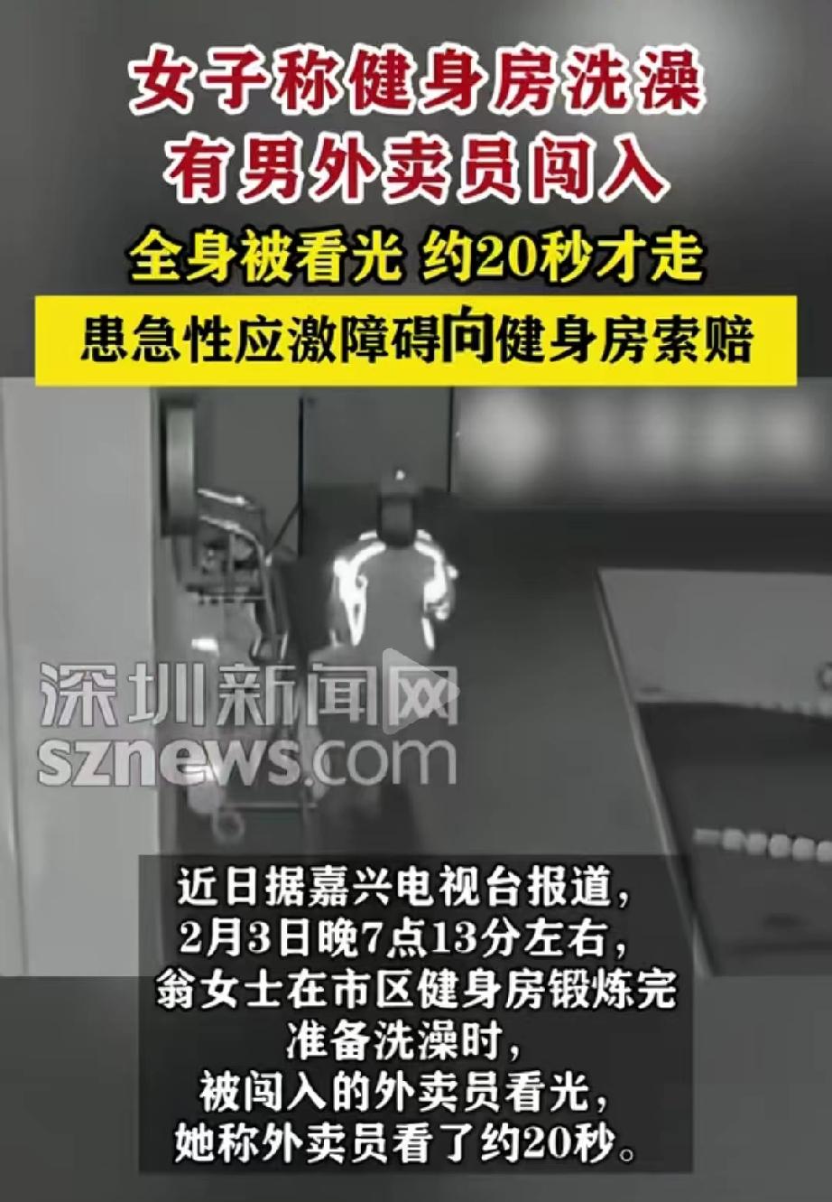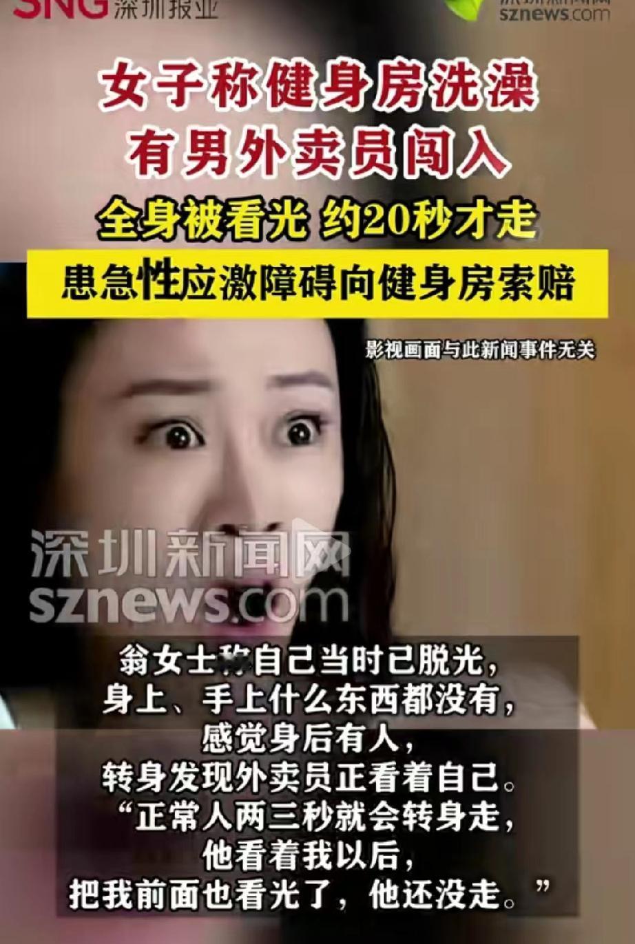 太糟心了!浙江嘉兴,女子到健完身到更衣室洗澡,突然,她觉得背后凉嗖嗖的,好像有双眼睛在盯着她,转身一看,竟发现是个外卖员。当时女子身上一丝不挂,外卖员看到她转身后,一直没有离开,足足盯了有20几秒。女子又羞又气,立刻报警。考虑到对方送外卖也不容易,她只要求男子赔偿了300元。谁知事后,她发现自己患上了急性应激障,于是,找到健身房要求赔偿,但对方的态度让她气愤。 2月3号晚上7点多,翁女士跟往常一样,在市区那家熟悉的健身房练完了最后一组动作,浑身是汗。 她收拾了一下东西,想着赶紧冲个澡,然后清清爽爽的回家休息。 更衣室里没什么人,非常安静的,她把衣服脱了,光着身子正准备往淋浴间走,手上空空荡荡的,什么也没拿。 就在这时候,她突然感觉背后有点不对劲,好像有一双眼睛在看她。 她猛一回头,脑袋嗡的一下炸了。一个陌生男人就站在她身后不远,眼睛正直勾勾地盯着她,从上到下。 对方是个外卖员,身上还穿着工作服,手里攥着手机,不知道是刚送完餐还是走错了地方。 翁女士整个人僵住了,脑子里一片空白。对方看见她转过身,竟然没走,还是站在原地,眼睛也没挪开。 一秒,两秒,五秒,十秒,翁女士后来回忆说,那一刻长得像过了一个世纪,她感觉自己从头到脚都被看光了,可对方就像钉在那儿似的。 正常人不小心走错了,看一眼反应过来,两三秒肯定转身就走了,可他一直看着自己,直到她转身,把她前面全看光了,他还没走。 前前后后,足足看了有二十秒。 翁女士终于反应过来,尖叫了一声,抓起手边的东西挡住自己。那外卖员这才像是回过神来,扭头跑了出去。 她赶紧穿上衣服就报了警,警察来得很快,找到了外卖员。 他表示,自己是送餐送错了地方,从一扇消防门钻进来的,不知道里面是女更衣室。 翁女士看着他那个样子,心里又气愤又委屈,可想到人家风里来雨里去送外卖也不容易,最后没往死里追究。对方赔了300块钱,这事算是了结了。 可事情还没完,远比翁女士想象中的严重。 从那天晚上开始,翁女士就不对劲了。洗澡的时候老觉得背后有人,晚上睡觉不敢关灯,一闭眼就是那双直勾勾盯着她的眼睛。 去医院一看,医生说是急性应激障碍,受刺激太大,心理出了毛病。 她越想越气。外卖员是赔了钱,可健身房呢?消防门随便让人钻进来,女更衣室一点安全保障都没有,这责任就这么算了? 于是,她去找健身房讨要说法。 健身房的管理人员倒是一脸客气,说这事吧,主要责任肯定在外卖员,当然,他们这边也有疏忽,愿意全额退还1200元的半年卡,并补偿300块钱,跟那个外卖小哥赔的数目一样。 翁女士听完,非常气愤。 他们就觉得,自己只是被看了几眼,赔点钱就完了,可她受的惊吓,夜不能寐的晚上,还有得的这个病,难道就值300元? 所以,她完全没法接受这个方案。 双方协商不下,翁女士将自己的遭遇发到了网上,网上说什么的都有。 外卖员真是没素质,再怎么送错餐,进了女更衣室看到人光身子,早该立马跑,还盯着二十秒,纯属故意。 也有人表示,让人看了二十秒,要赔偿还要追究责任,是不是有点过了。 说翁女士过分的,纯属站着说话不腰疼,被人当众窥视,还得精神病,要赔偿、追究责任太正常了,换谁都得生气。 《民法典》第1198条规定:宾馆、商场、银行、车站、机场、体育场馆、娱乐场所等经营场所、公共场所的经营者、管理者或者群众性活动的组织者,未尽到安全保障义务,造成他人损害的,应当承担侵权责任。 外卖员未经许可进入女更衣室,长时间窥视他人身体,直接侵害翁女士隐私权与身体权,已构成侵权。 翁女士确诊急性应激障碍,属于精神损害,有权主张相应赔偿。 健身房作为经营主体,未锁闭消防门、未对私密区域有效管控,明显未尽到安全保障义务,仅退卡、补偿300元不足以弥补翁女士的精神损害与健康损失。