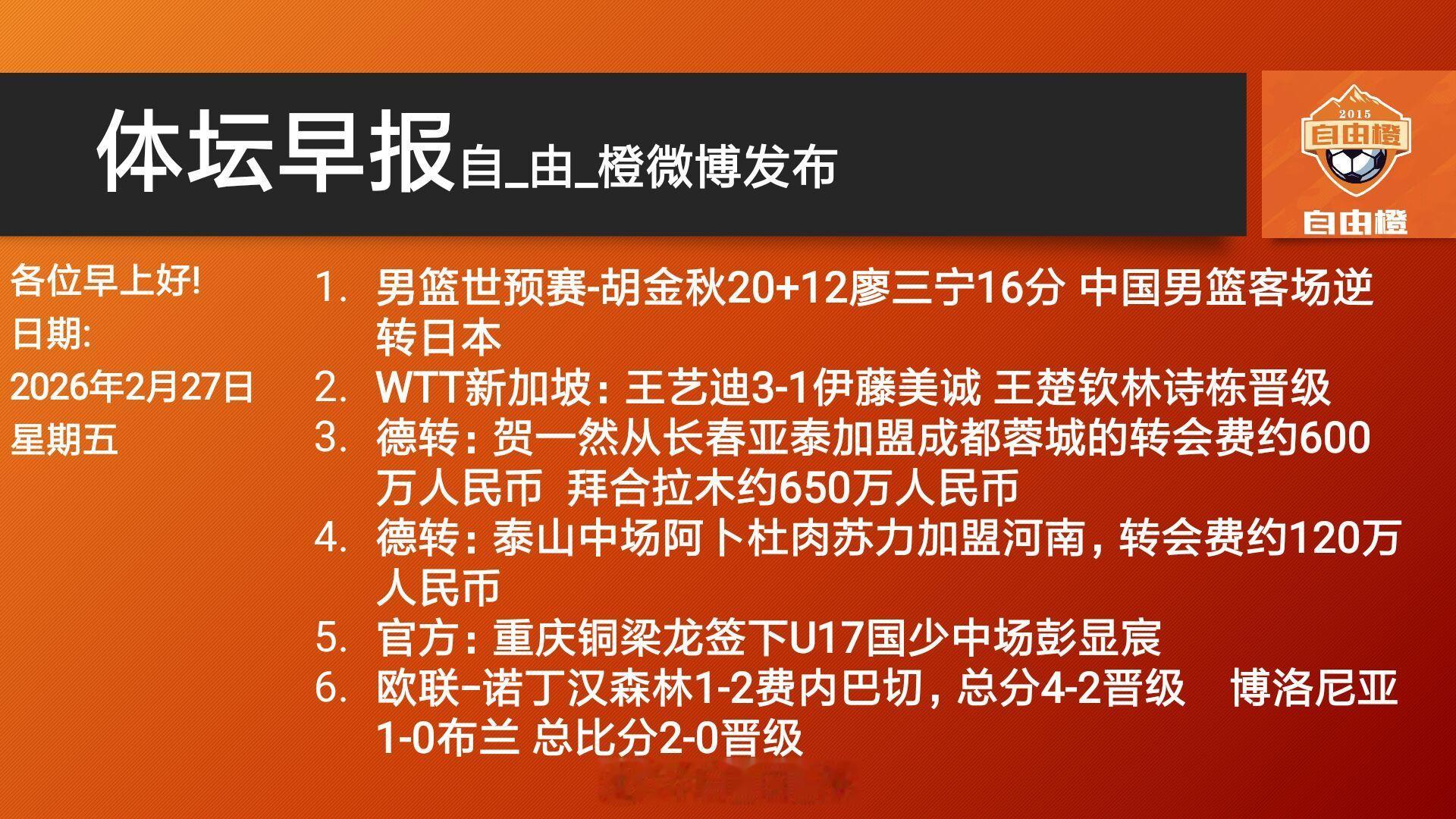 🌐《自由橙足球早报》 02.27 周五➭诺丁汉森林1-2费内巴切,总分4-2晋级,奥多伊破门➭水晶宫2-0莫斯塔尔日林斯基,总分3-1晋级,盖桑破门➭佛罗伦萨总比分5-4雅盖隆晋级,马祖雷克戴帽,法乔利破门➭里尔总比分2-1红星晋级,吉鲁闪击,恩戈伊破门➭友谊赛-墨西哥4-0大胜冰岛,布里安-古铁雷斯、赫苏斯-加利亚多破门➭维尼修斯欧洲出场数追平内马尔,前者共造216球,后者造379球➭官方:拜仁和曼城旧将德米凯利斯出任马略卡一线队主帅➭官方:布伦特福德与主帅基思-安德鲁斯续约至2032年➭官方:尤文与35岁三门平索利奥续约至2027年➭官方:洛杉矶与上赛季美职联银靴布安加续约至2028年➭官方:C罗收购阿尔梅里亚25%的股份,这些股份归他子公司所有➭热身赛深圳新鹏城3-1大连鲲城,周定洋、阿代米、奥乌苏破门➭官方:成都蓉城中卫元敏诚加盟辽宁铁人,转会费约200万人民币➭官方:克罗地亚中场托利奇加盟浙江队,双方将签约3年,将身披浙江10号球衣➭官方:海港球员冯劲租借离队,阿布拉汗、古斯塔沃加盟河南➭天津津门虎官方:葡超阿维什镇中场豪梅-格劳加盟俱乐部➭官方:天津津门虎签下西乙布尔戈斯队长后卫科尔多瓦,球员转会费30万欧➭官方:天津津门虎签下巴西前锋吉列尔梅-谢蒂内➭德转:上海海港边锋冯劲租借加盟大连英博➭德转:泰山中场阿卜杜肉苏力加盟河南,转会费约120万人民币➭德转:方昊从北京国安加盟浙江队的转会费约500万人民币➭德转:贺一然从长春亚泰加盟成都蓉城的转会费约600万人民币➭德转:拜合拉木从新鹏城加盟成都的转会费约650万人民币➭德转:温州队门将买乌兰加盟青岛海牛,转会费约50万人民币➭德转:孙康博从湖北青年星加盟大连英博的转会费约400万人民币➭德转:季胜攀、乃博宁林自由转会天津津门虎自由橙体坛早报每日橙语