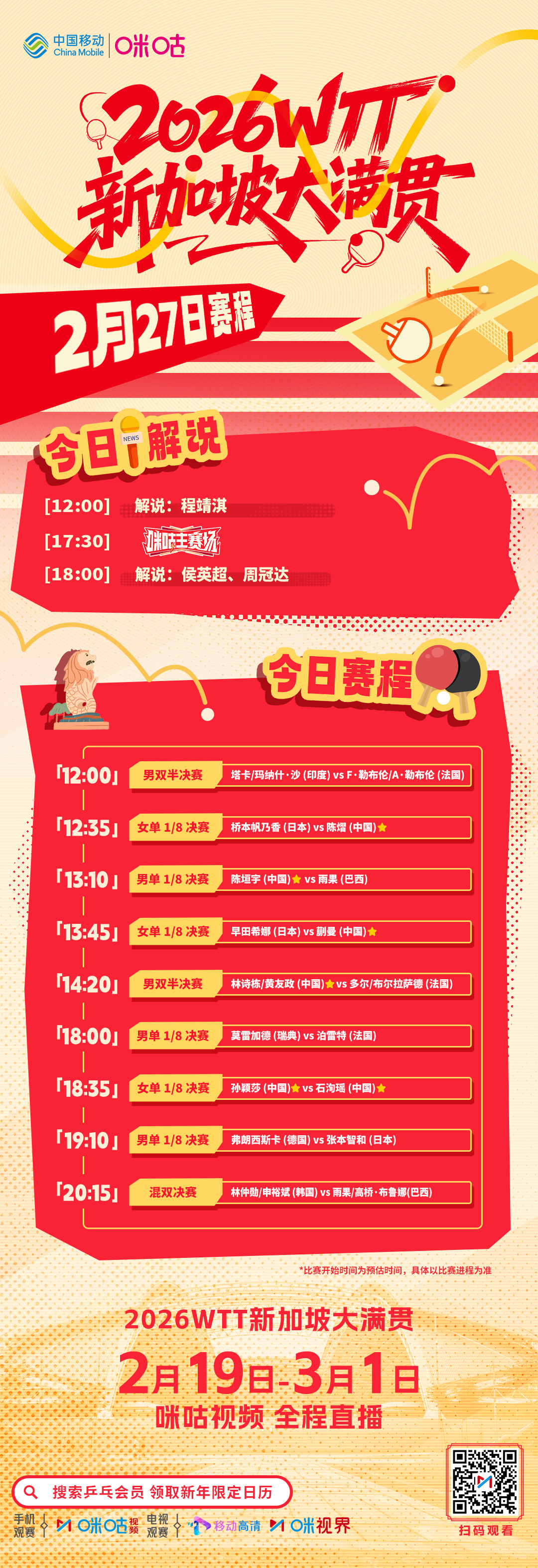 WTT新加坡大满贯27日重点赛程: