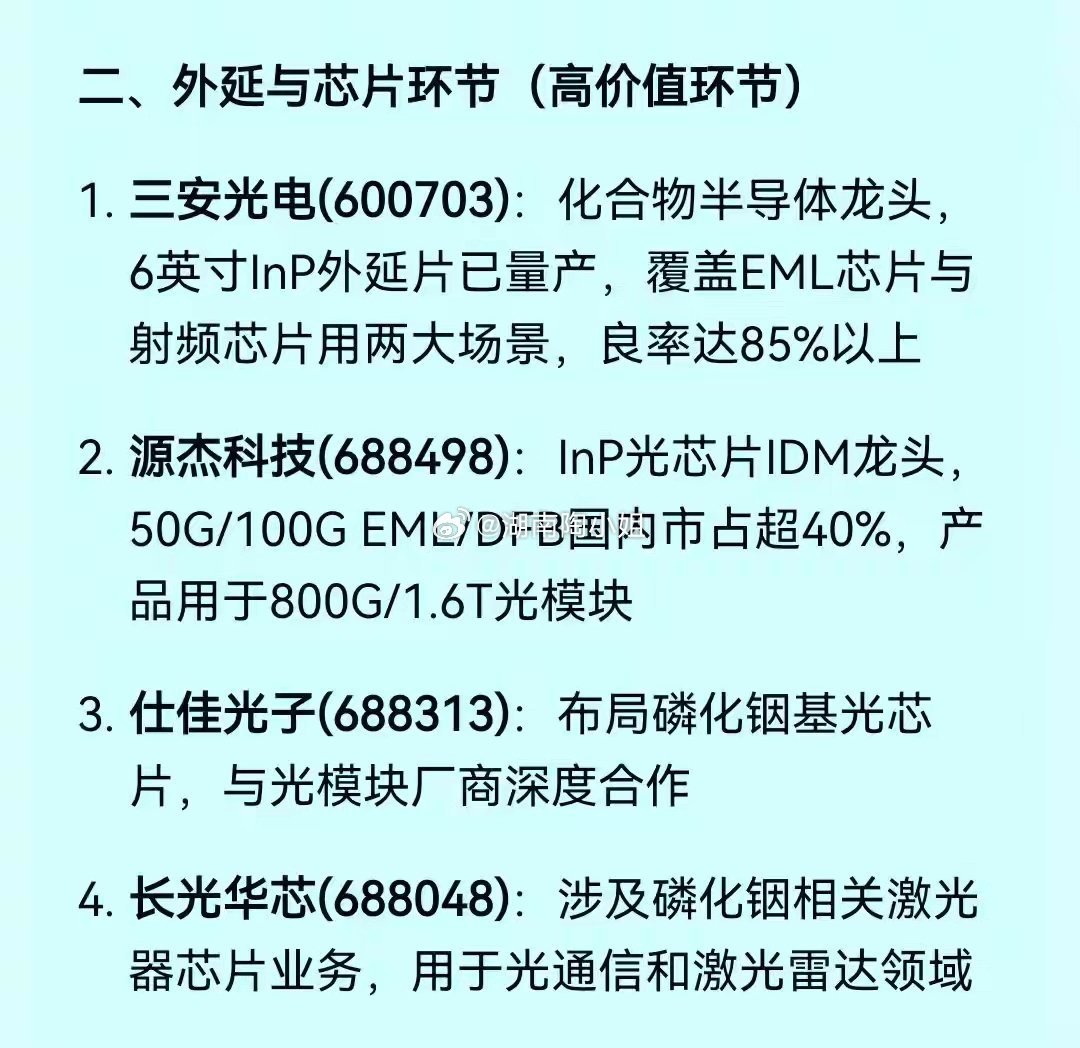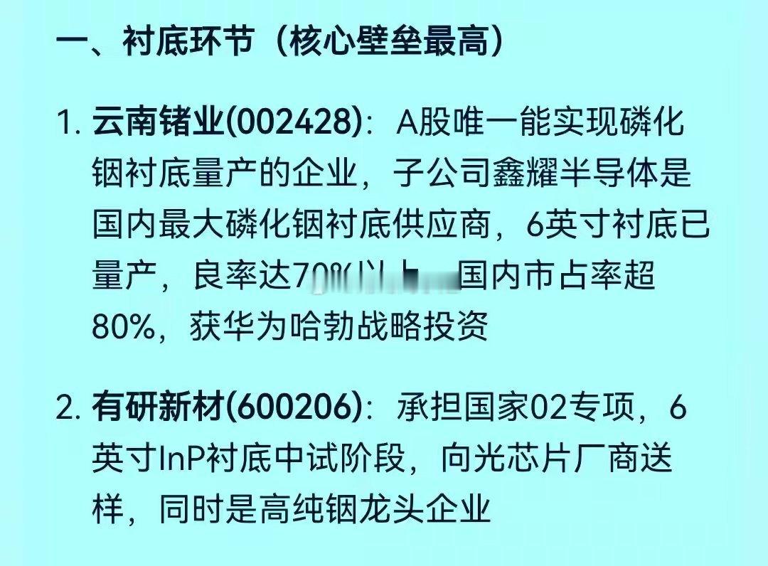 在A股上市公司中,云南锗业是A股唯一一家能够实现磷化铟衬底量产的企业。是该领域无可争议的行业龙头。同时公司的锗金属产量也是全球领先。不过公司股价在本轮牛市中从8元涨到44元。这几天股价又在历史高位连续涨停,短线注意股价高位回调风险。