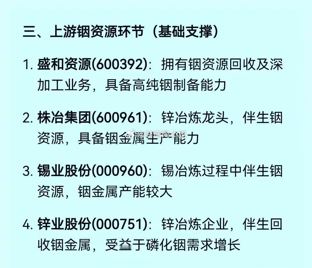 拥有磷化铟资源回收与深加工业务的盛和资源,这家公司是国内为数不多的高纯磷化铟制备企业。而株冶集团因为在冶炼锌的过程中获得伴生铟而具备磷化铟的生产能力 。锡业股份也因为在冶炼中获得伴生铟而具备金属铟的生产能力。