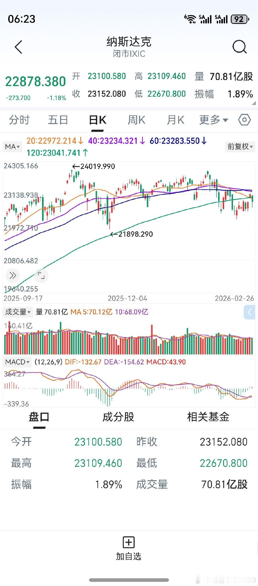 英伟达大跌,拖累了纳斯达克。对该指数,后市要提高警惕。20天线已经下穿120天线,后市40.60天线,料也将依次下穿。纳斯达克会不会由牛转熊,多加留意。就今天而言,希望对A股影响不大吧。