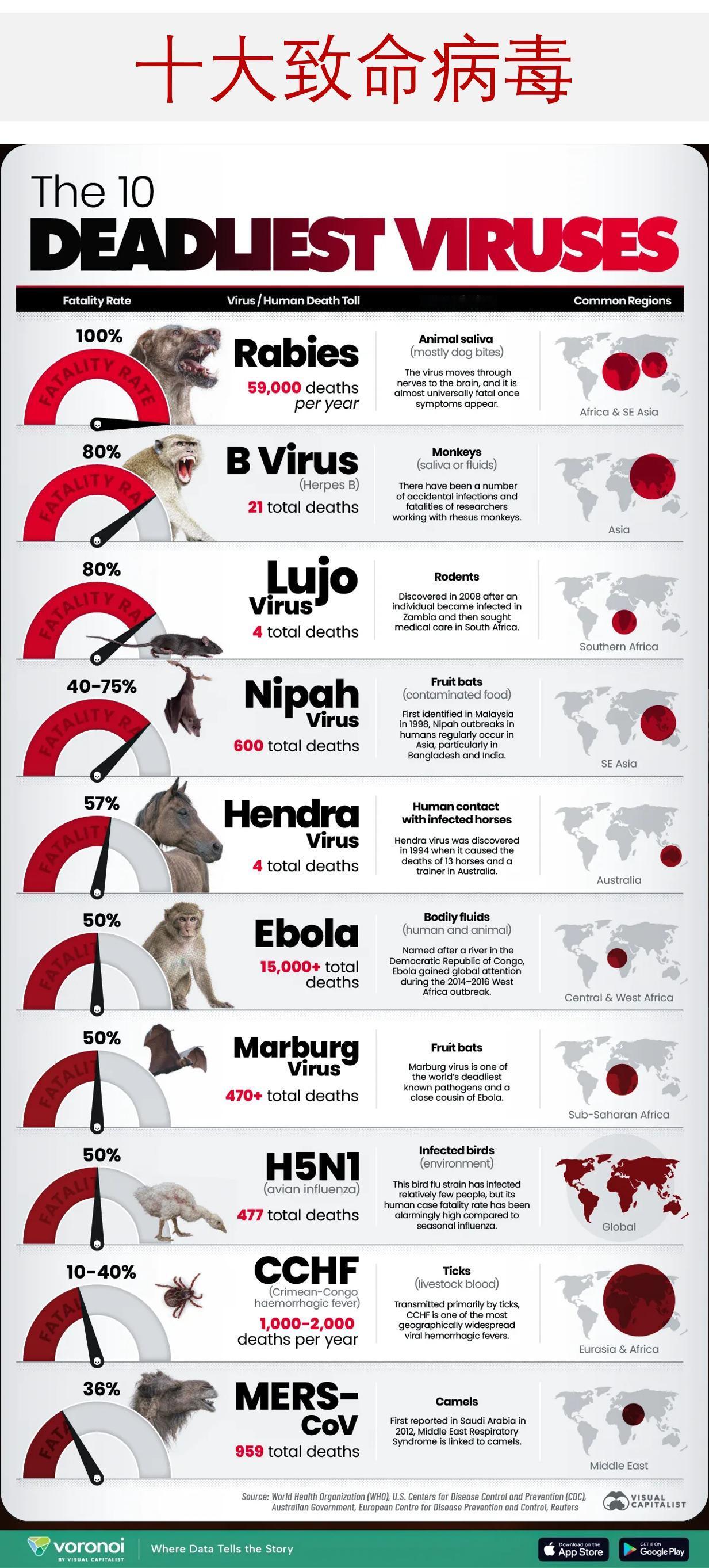 哪种病毒最致命?来看按致死率排名的全球十大致命病毒 有些病毒能感染数以百万计的个体,但致死人数却相对较少。而另一些病毒传播范围较窄,但一旦感染,其致命性却要强得多。 下面这张图表列出了全球 10 种致死率最高的病毒,其排名依据的是致死率:即感染病毒后死亡的人数占总感染人数的比例。 狂犬病位居榜首,一旦出现症状,其致死率几乎达到 100%。 此可视化图表所使用的数据来自多个来源,包括世界卫生组织(WHO)、不列颠哥伦比亚疾病控制中心、澳大利亚政府、欧洲疾病预防控制中心、路透社以及英国政府。 ——狂犬病:几乎必然致命 这种病毒每年导致约 59,000 人死亡,主要发生在非洲和东南亚地区。该病毒主要通过受感染动物(尤其是狗)的唾液传播。 尽管狂犬病是可以通过疫苗预防的,但其仍导致了数千人的死亡,主要发生在非洲和东南亚地区。无法获得及时的暴露后治疗是其持续造成大量死亡的主要原因。 ——出血热:埃博拉、马尔堡和克里米亚-刚果出血热 清单上的部分病毒会引发病毒性出血热,其中包括埃博拉病毒、马尔堡病毒以及克里米亚-刚果出血热(CCHF)。这些疾病通常会导致严重的内出血和器官衰竭。 埃博拉和马尔堡这两种病毒的致死率均约为 50%,其疫情多发于中非和撒哈拉以南非洲地区。2014 至 2016 年西非爆发的埃博拉疫情就导致了超过 11000 人死亡,并引起了全球对疫情防范工作的关注。 克里米亚-刚果出血热主要通过蜱虫和家畜传播,在欧亚大陆和非洲的分布范围更为广泛。其致死率在 10%至 40%之间,每年估计造成 1000 至 2000 人死亡。 ——人畜共患疾病传播:从蝙蝠到骆驼 这里列出的大多数病毒都源自动物。果蝠与尼帕病毒和马尔堡病毒有关,而啮齿动物则与Lujo病毒有关。骆驼则是 MERSCoV 的主要宿主,该病毒于 2012 年在沙特阿拉伯首次被发现。 禽流感(H5N1)由受感染的禽类传播,确诊的人类病例死亡率约为 50%——远高于季节性流感。尽管人类感染病例仍相对少见,但高死亡率使全球卫生部门始终保持警惕。