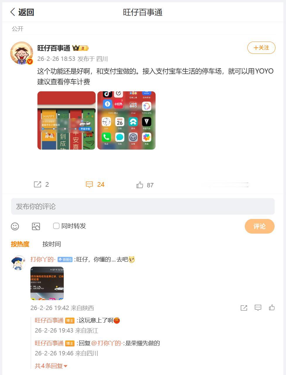 荣耀MagicOS的YOYO建议,现在已经接入蛮多主流APP,刚刚看到数码圈内大佬分享,接入支付宝之后,支付宝停车计费情况,也通过YOYO推荐卡片展示了出来,当然也上了灵动胶囊,大佬表示非常方便,互动的小伙伴表示:其实车辆违章记录,也能够通过YOYO推荐卡片展示出来 畅聊数码新品 数码资讯