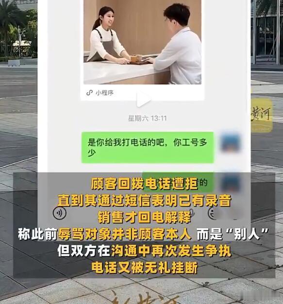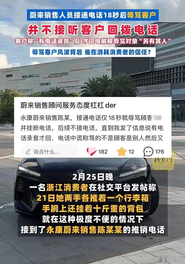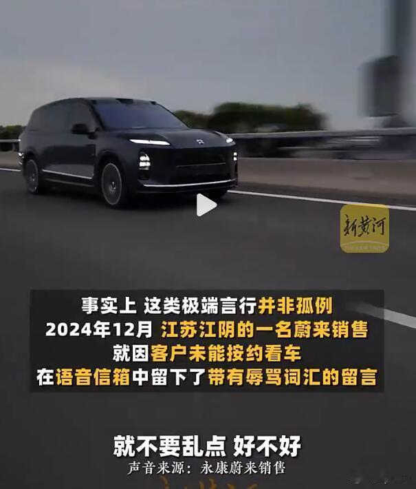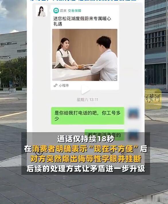 可能是我认知比较短浅,销售顾问是可以辱骂顾客的吗?都说“顾客就是上帝”,品牌方都把自己的顾客当成金主爸爸,不管是老客户还是潜在客户。我也接到过不少新势力销售的电话,春节前后就接到了不下20个,啥品牌的都有。在我表示不方便、暂不考虑之后,对方一般就是先请求加个微信,我再拒绝的话,对方就“抱歉、打扰、生活愉快”一键三连,都挺客气,也没有爆粗的。希望蔚来这档子事只是一个个例,内部也该加强管理了,而且已经不是第一次了,就算你们想对顾客指指点点,麻烦也在私下里好吗?别太明显好吗?女孩拒绝蔚来销售推销遭辱骂蔚来客服回应女孩拒绝推销遭辱骂蔚来